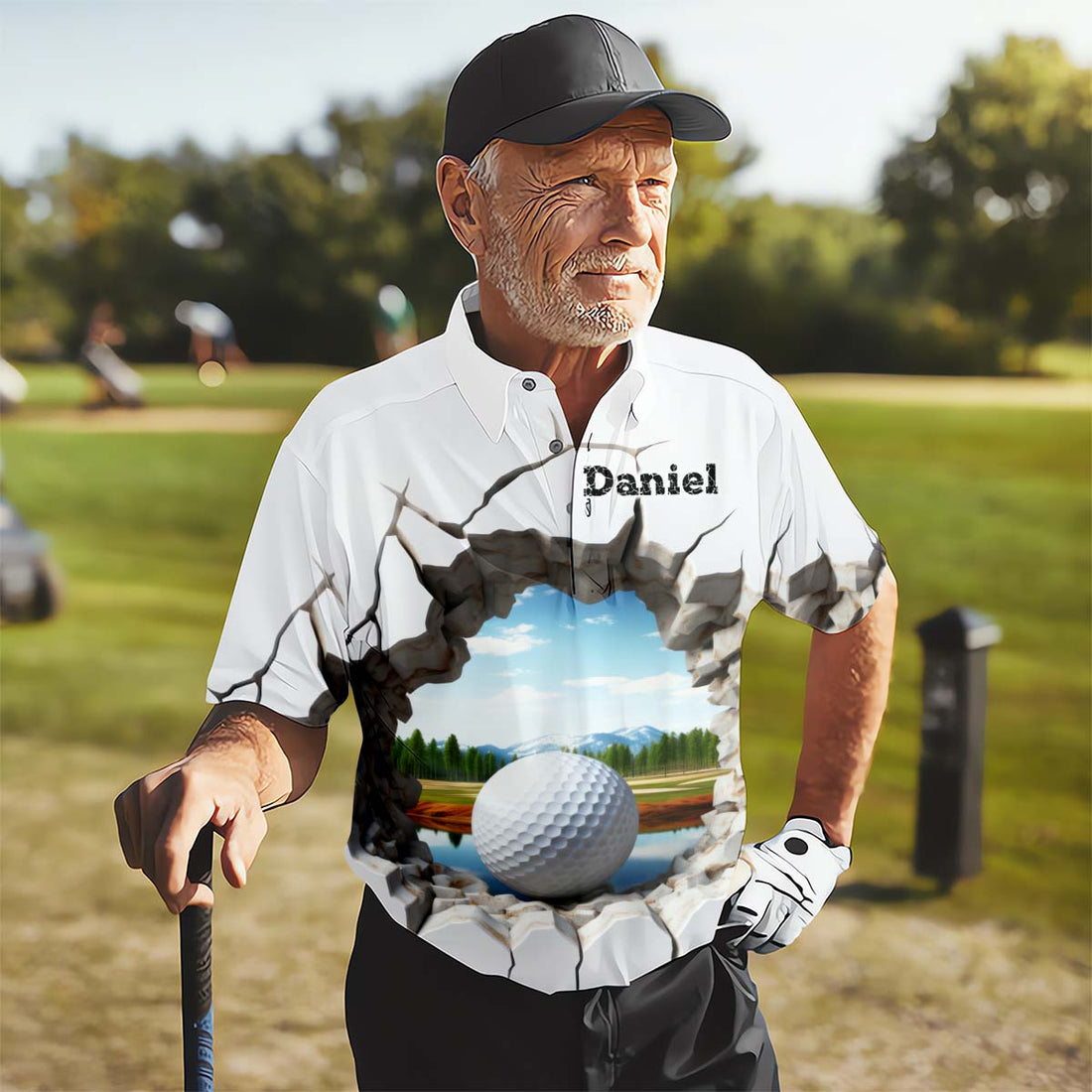3D Golf Ball Lake Hole In A Wall Fun Men's Golf Polos, Unique Gift For Golfer, Mens White Polo
