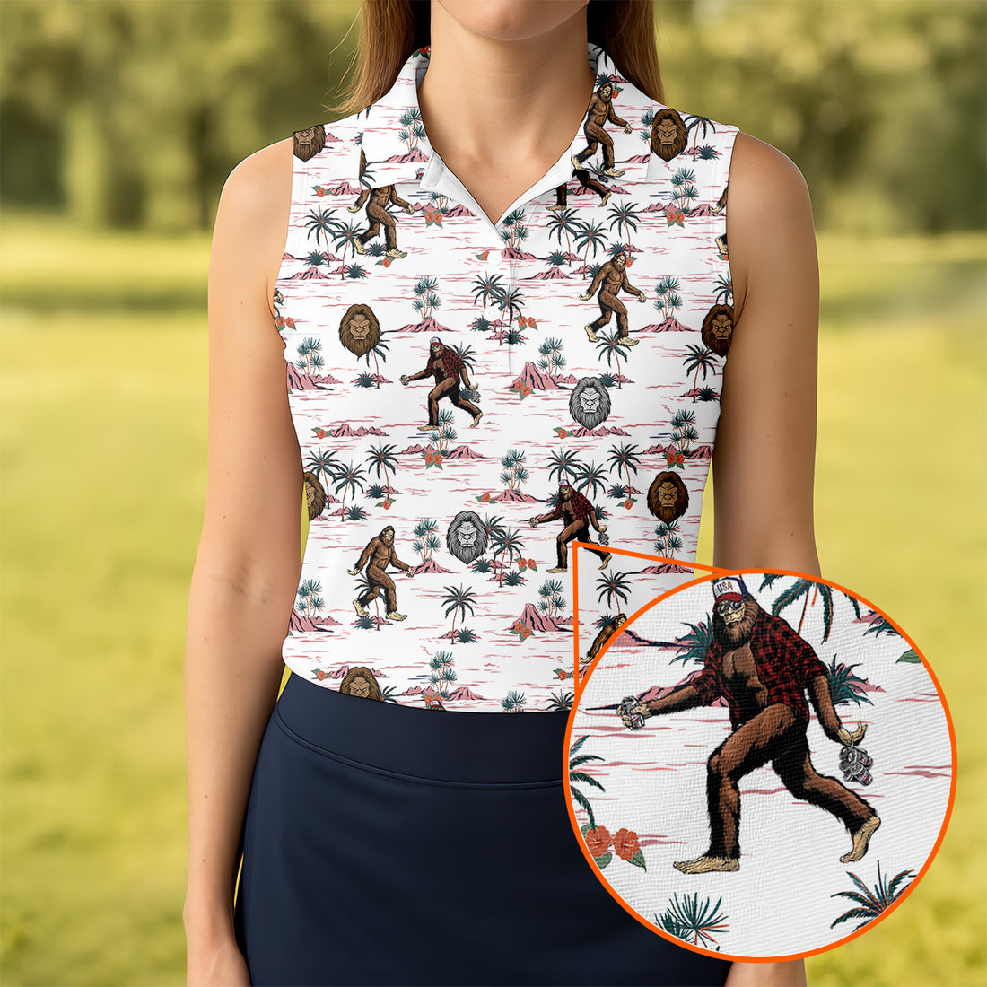 White Funny Sasquatch Tropical Golf Shirts, Funny Golf Shirts Women, Ladies Golf Shirts, Golfing Apparel