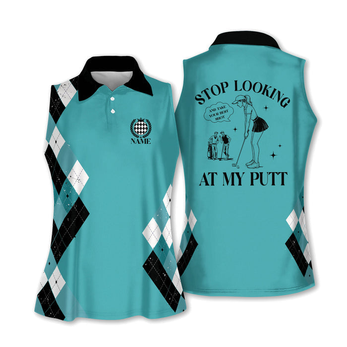Stop Looking At My Putt Custom Sleeveless Womens Golf Polo Shirts, Funny Golf Shirts Women