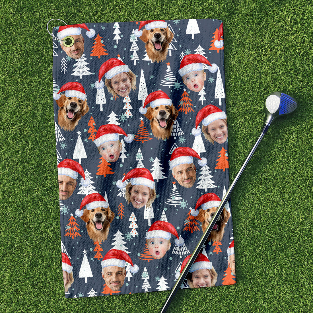 Custom Face Xmas Pattern Golden Print Golf Towels, Christmas Golf Gift, Custom Golf Accessories