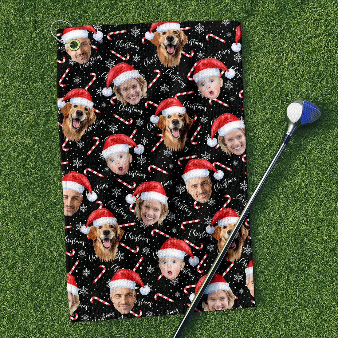 Custom Face Candy Cane Christmas Black Golf Towels, Christmas Golf Gift, Custom Golf Accessories