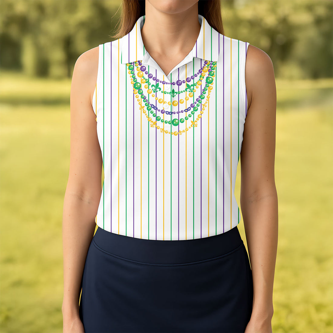 Mardi Gras Beads Necklaces Print Green Golf Shirt, Women's Golf Shirts, Ladies Golf Polos, Golf Shirt For Women