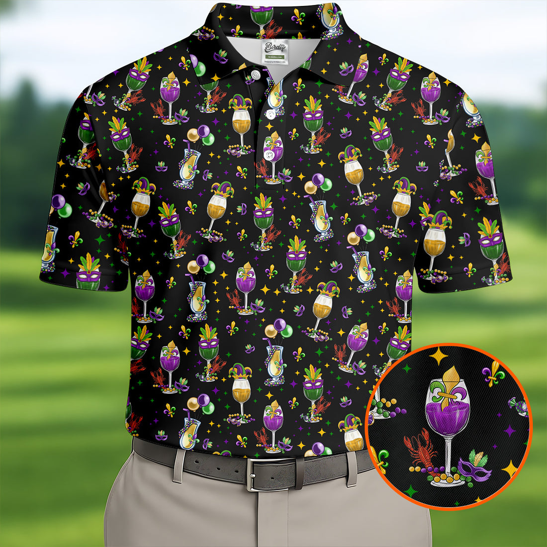 Mardi Gras Wine Glass Beaded Garland Fleur De Lis Black Golf Shirt, Polo Shirts For Men, Golf Shirts For Men