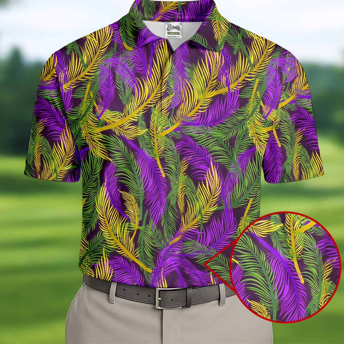 Purple Green Gold Feather Pattern Mardi Gras Golf Shirt, Polo Shirts For Men, Golf Shirts For Men