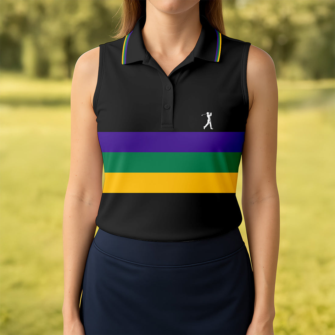 Mardi Gras Purple Green Gold Horizontal Stripes Black Golf Shirt, Women's Golf Shirts, Ladies Golf Polos