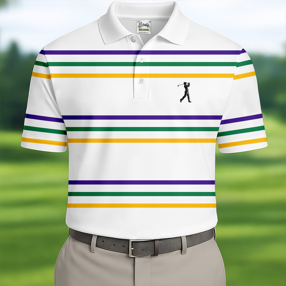 Mardi Gras Purple Green Gold Stripe Pattern Golf Tops For Men, Men's White Polo, Golf Shirts For Men
