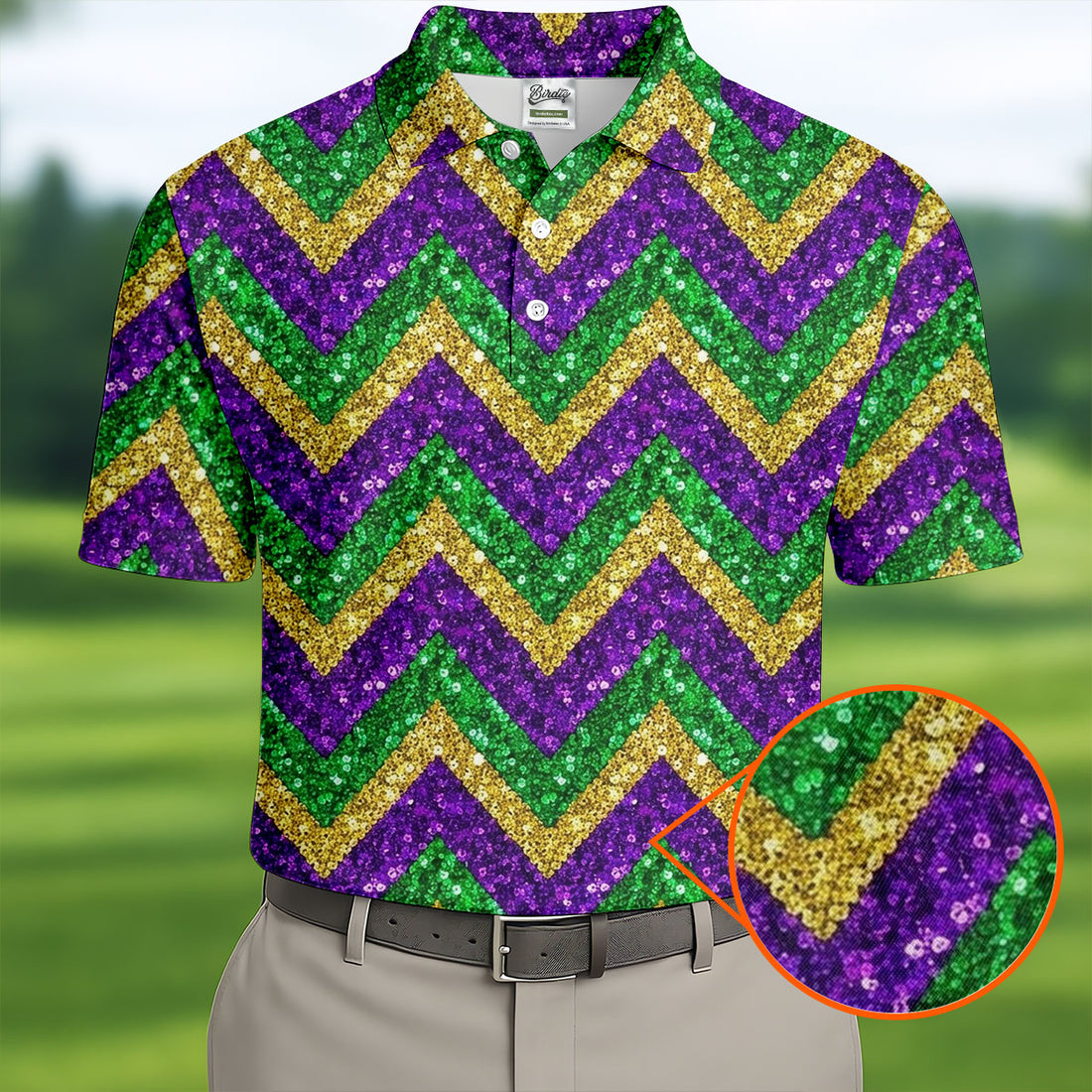 Mardi Gras Purple Gold Green Zigzag Pattern Glitter Print Golf Tops For Men, Polo Shirts For Men, Golf Shirts For Men
