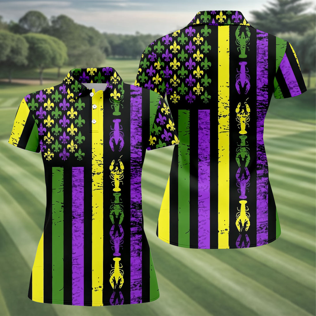 Mardi Gras Flag Fleur-De-Lis Symbol Crawfish Pattern Women's Golf Tops, Women's Golf Shirts, Ladies Golf Polos