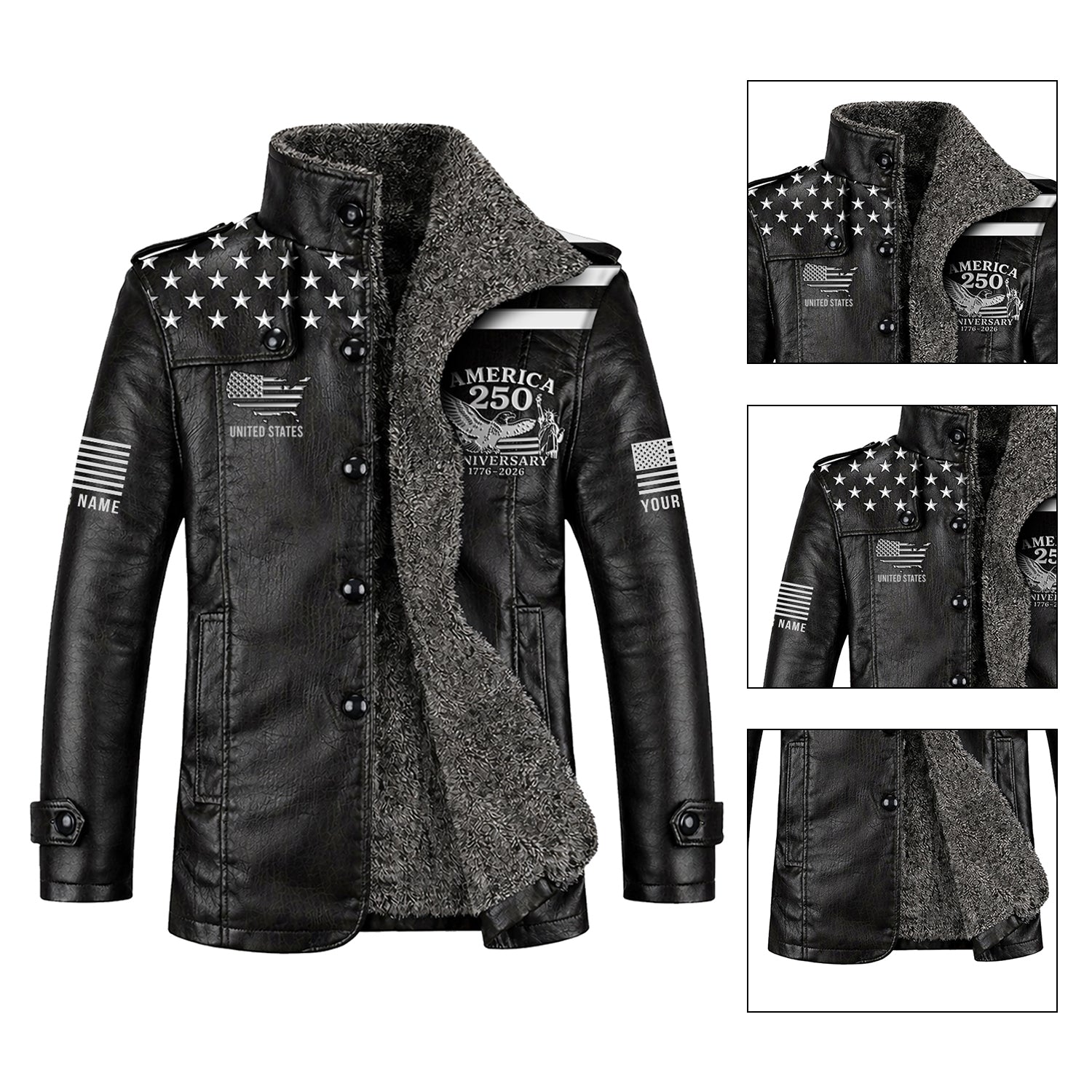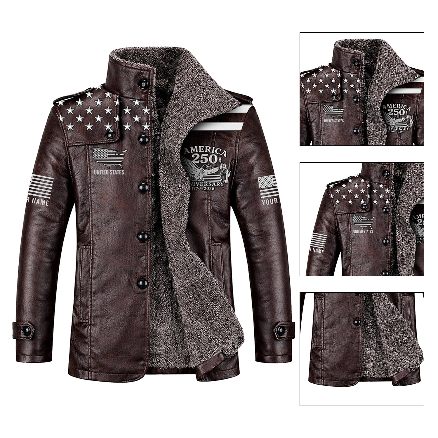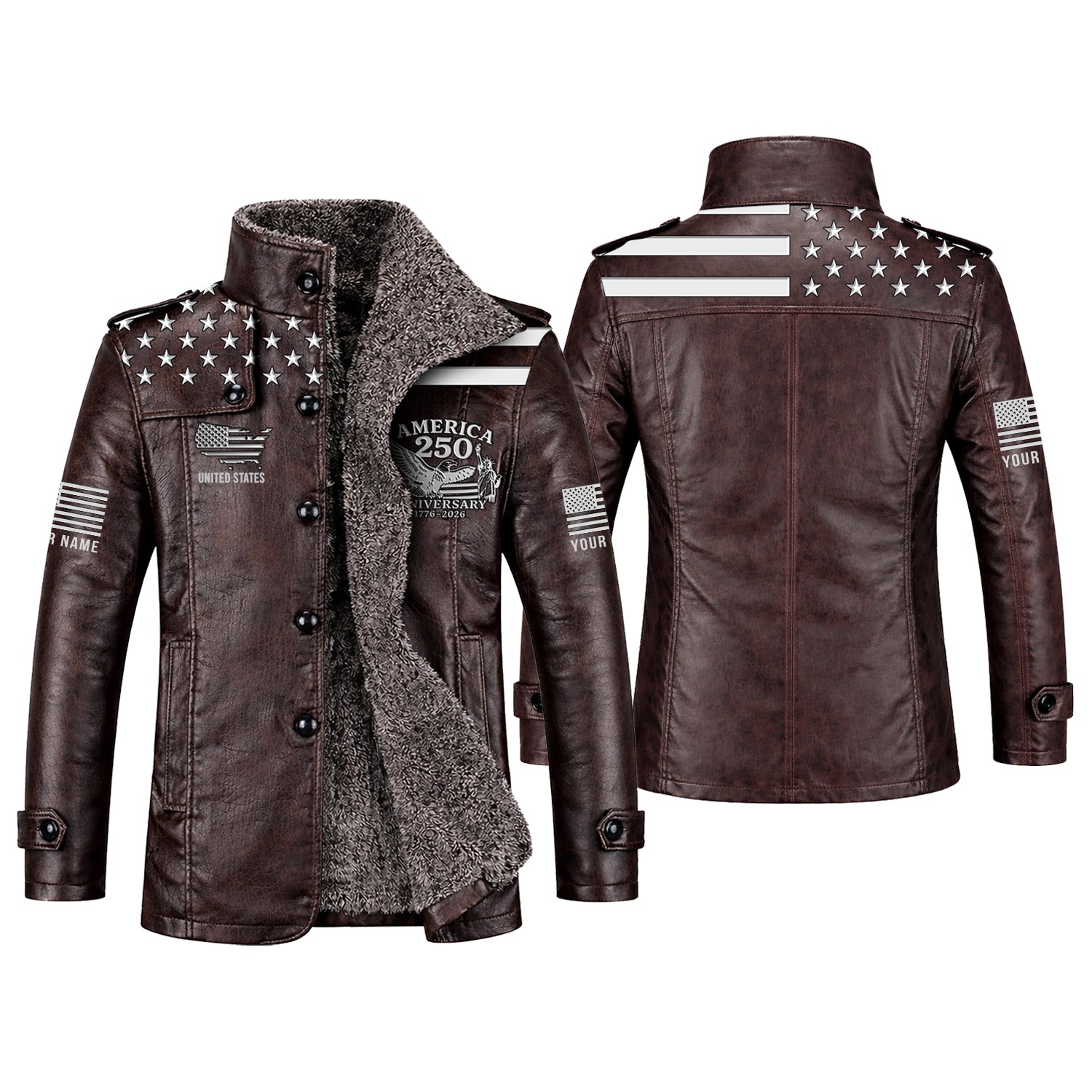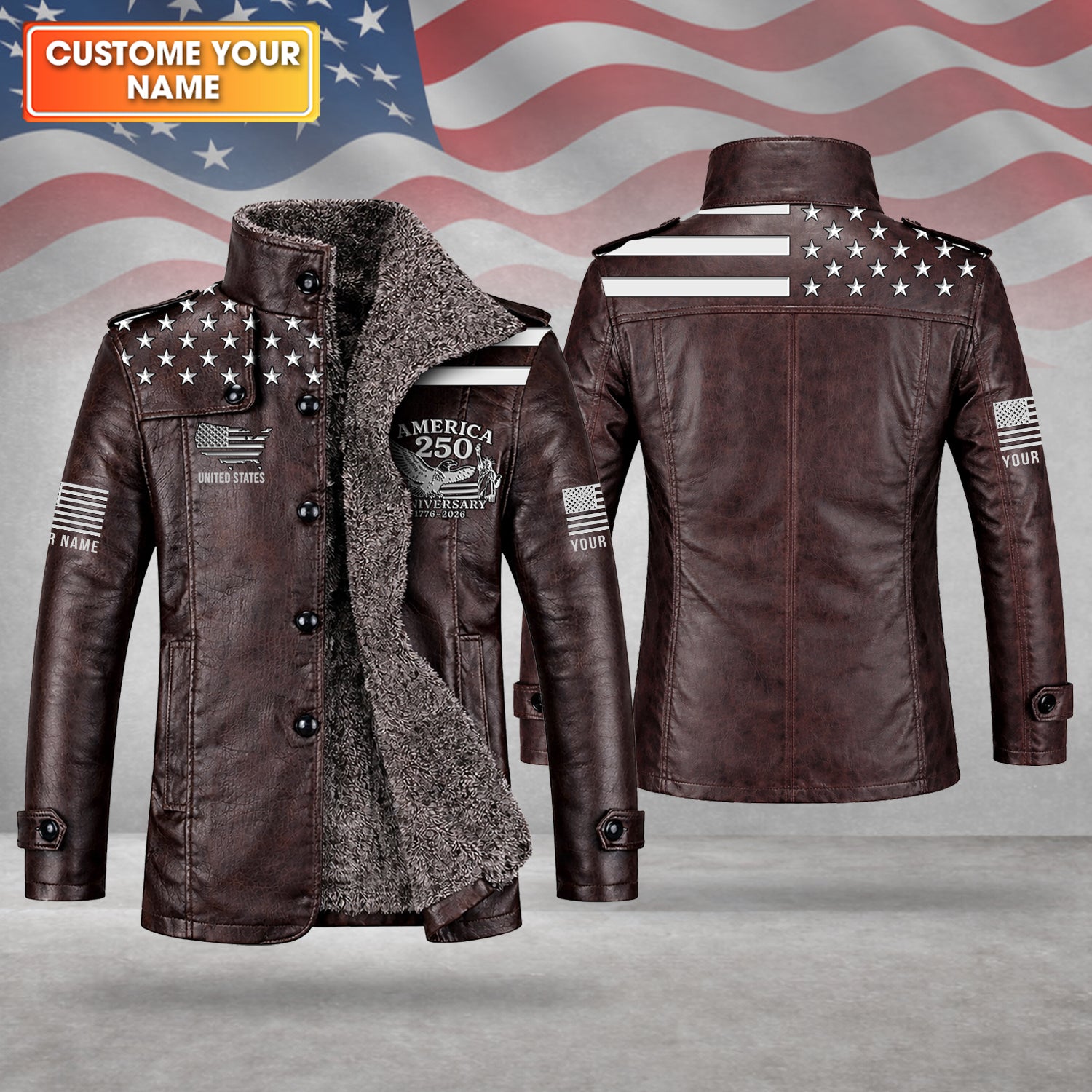 250 Years Red White Blue USA Flag Pattern Men's Cold Premium Weather Jacket, Leather Trench Coat