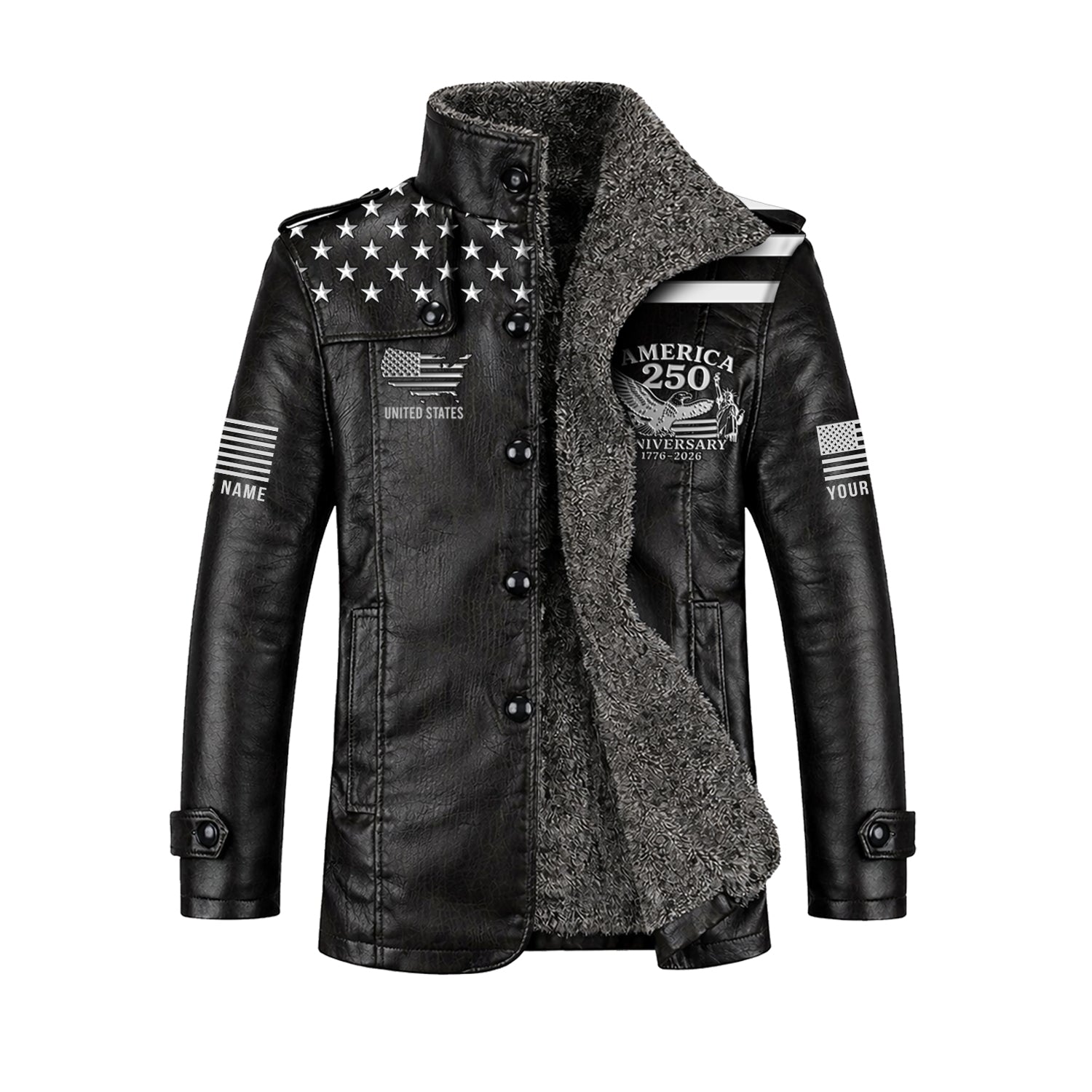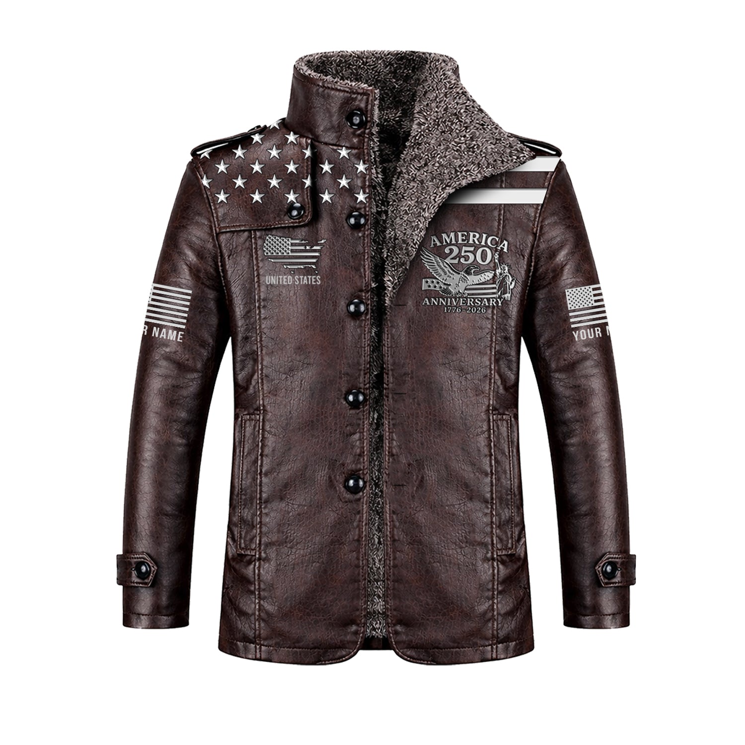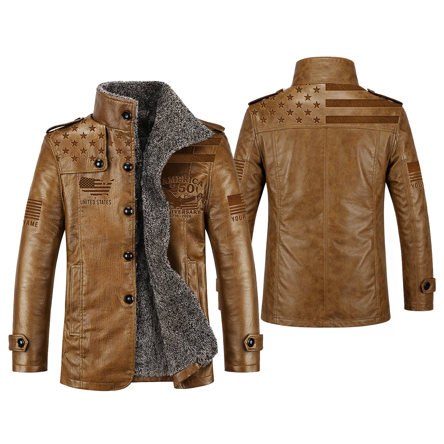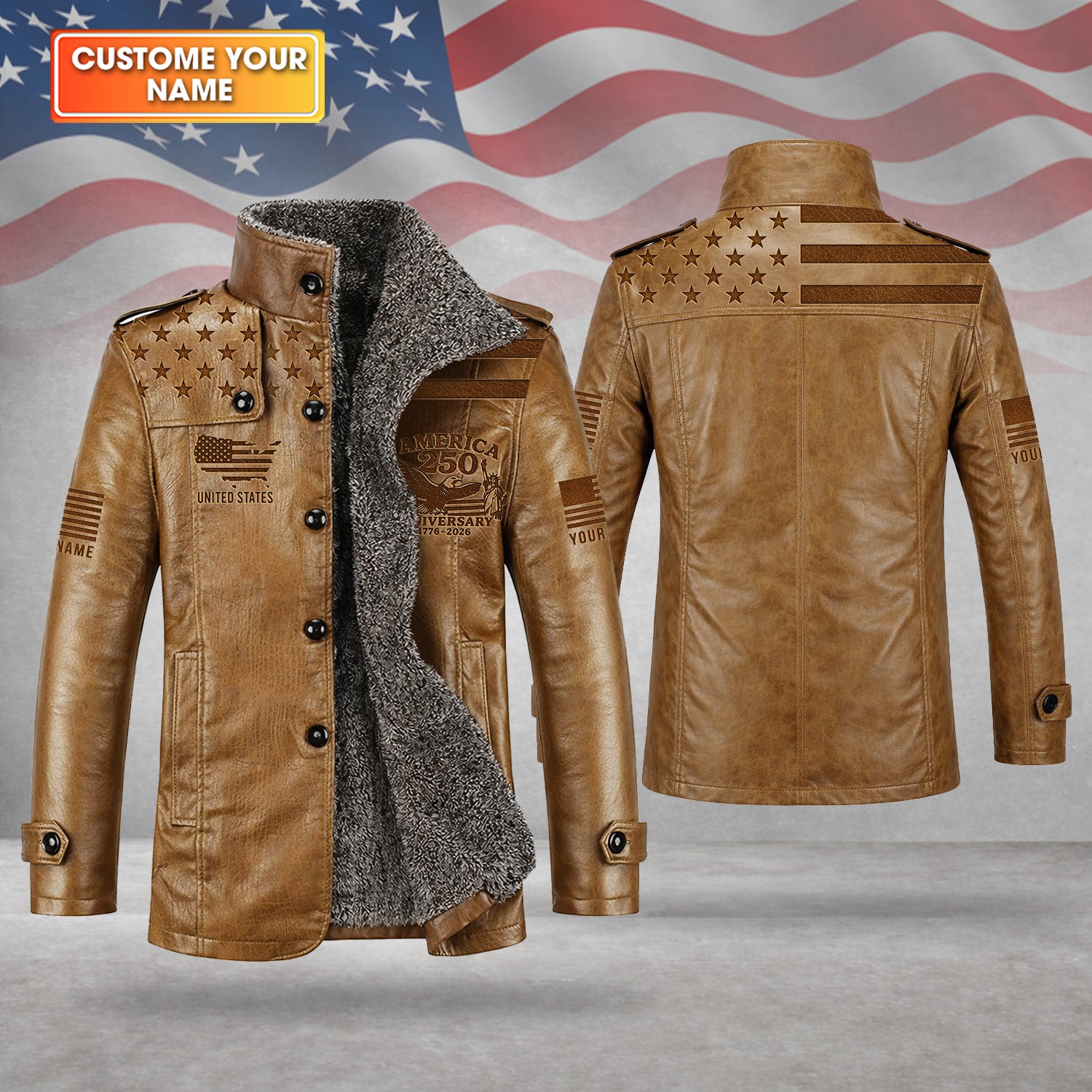 250 Years Red White Blue USA Flag Pattern Men's Cold Premium Weather Jacket, Leather Trench Coat