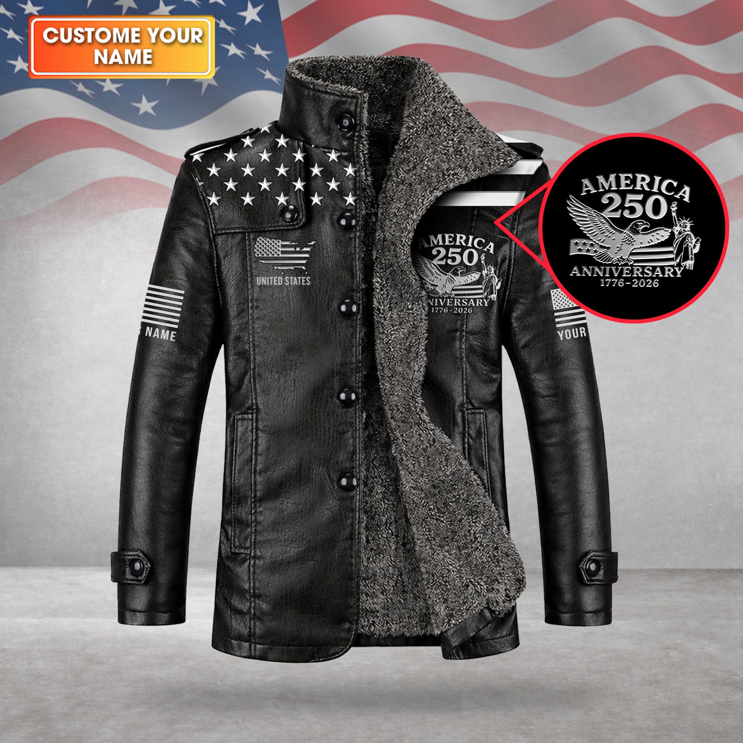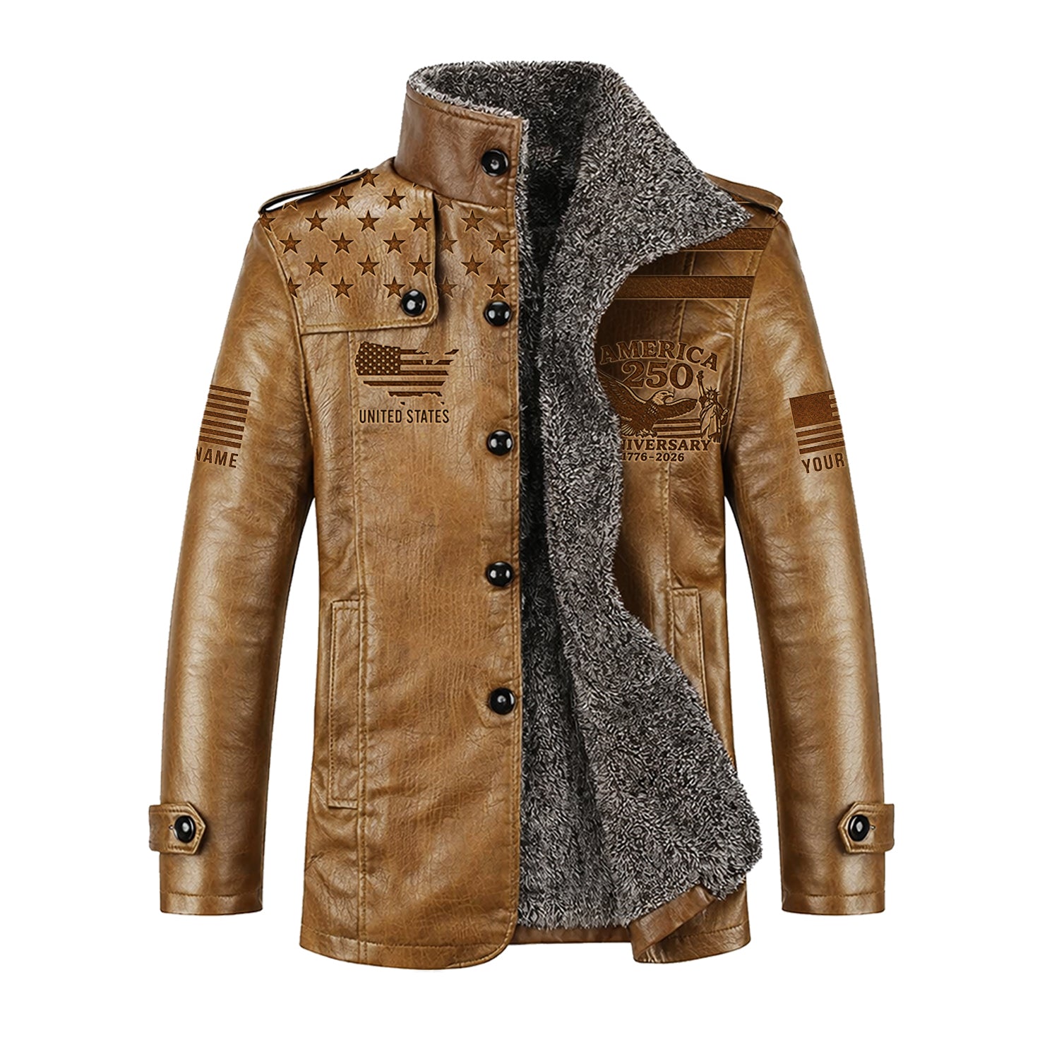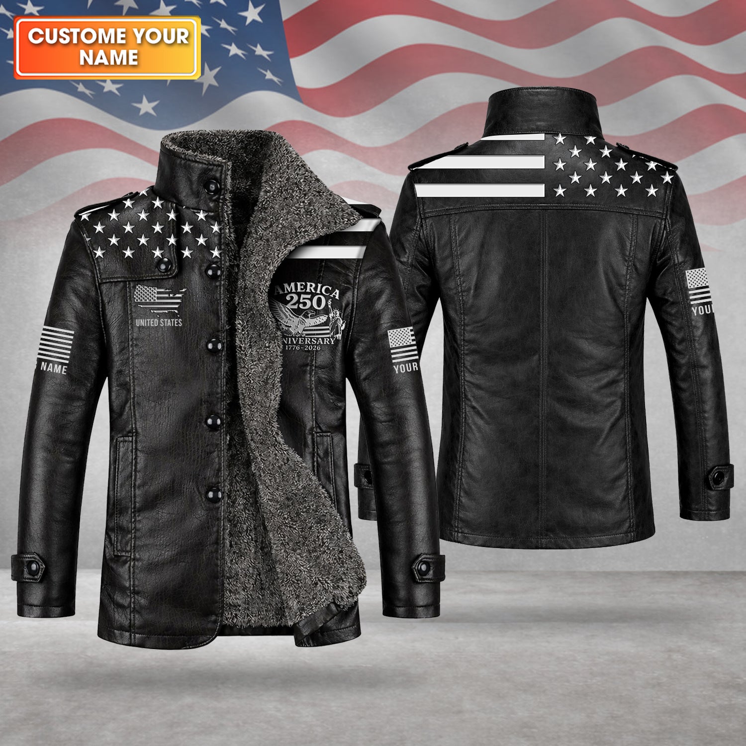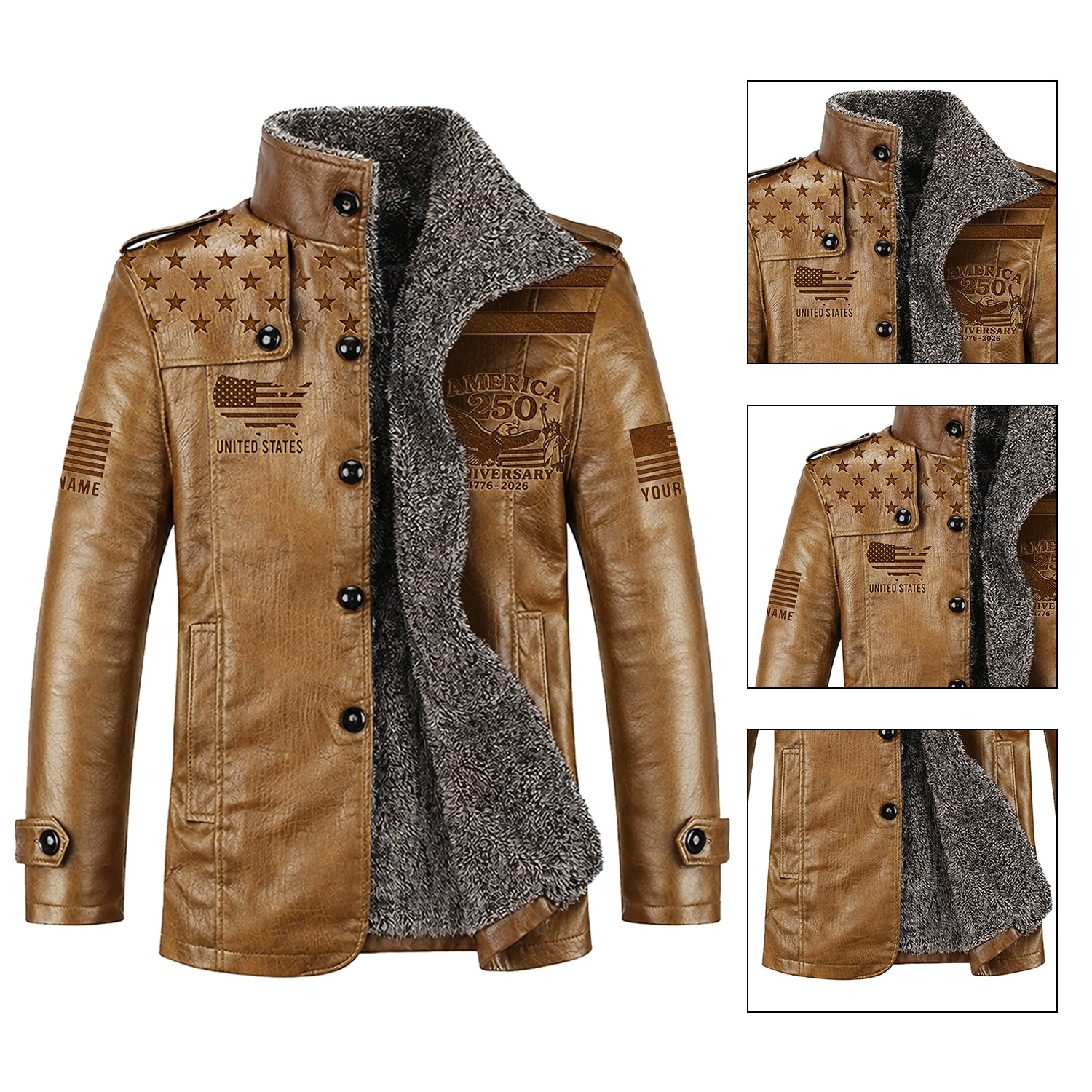 250 Years Red White Blue USA Flag Pattern Men's Cold Premium Weather Jacket, Leather Trench Coat