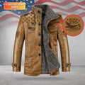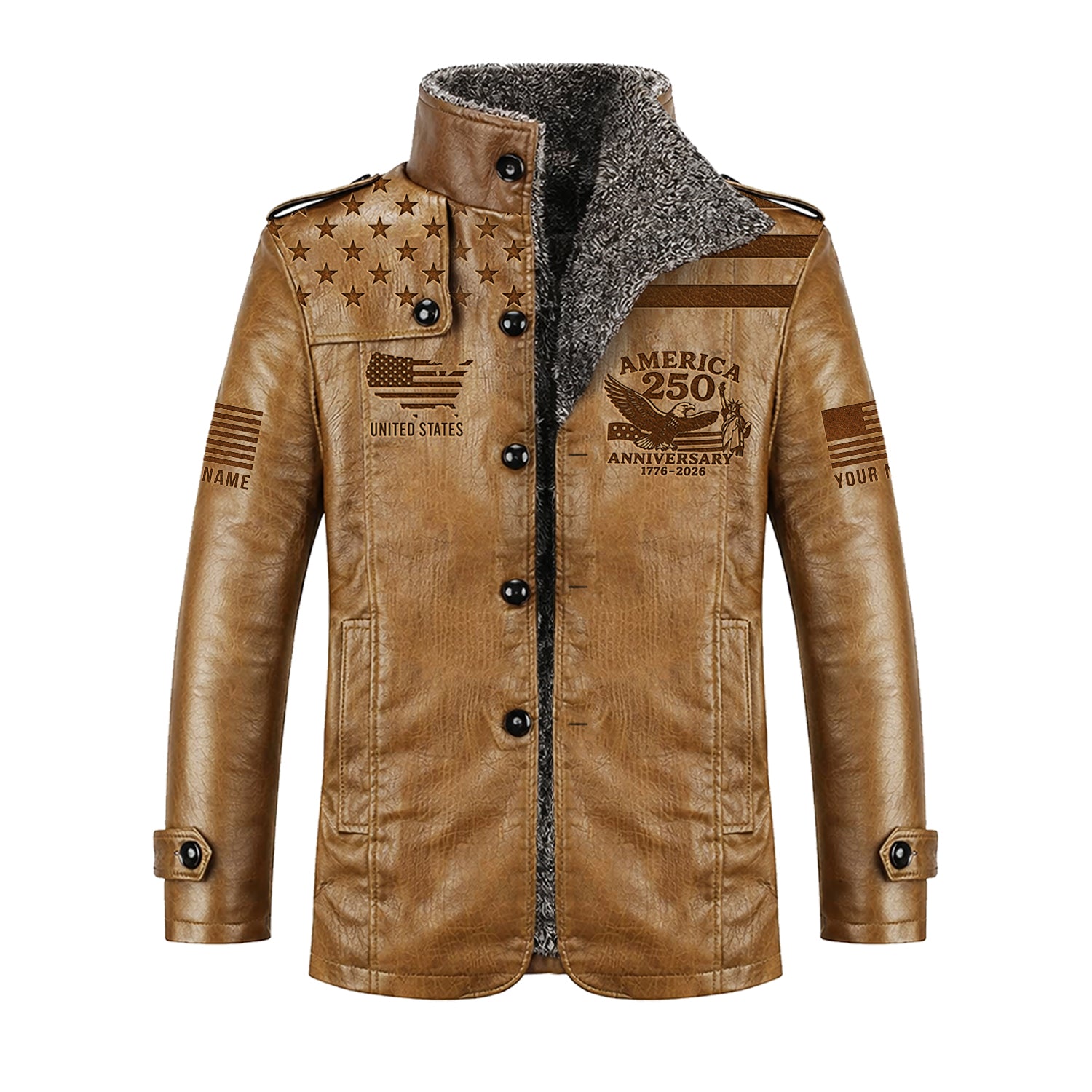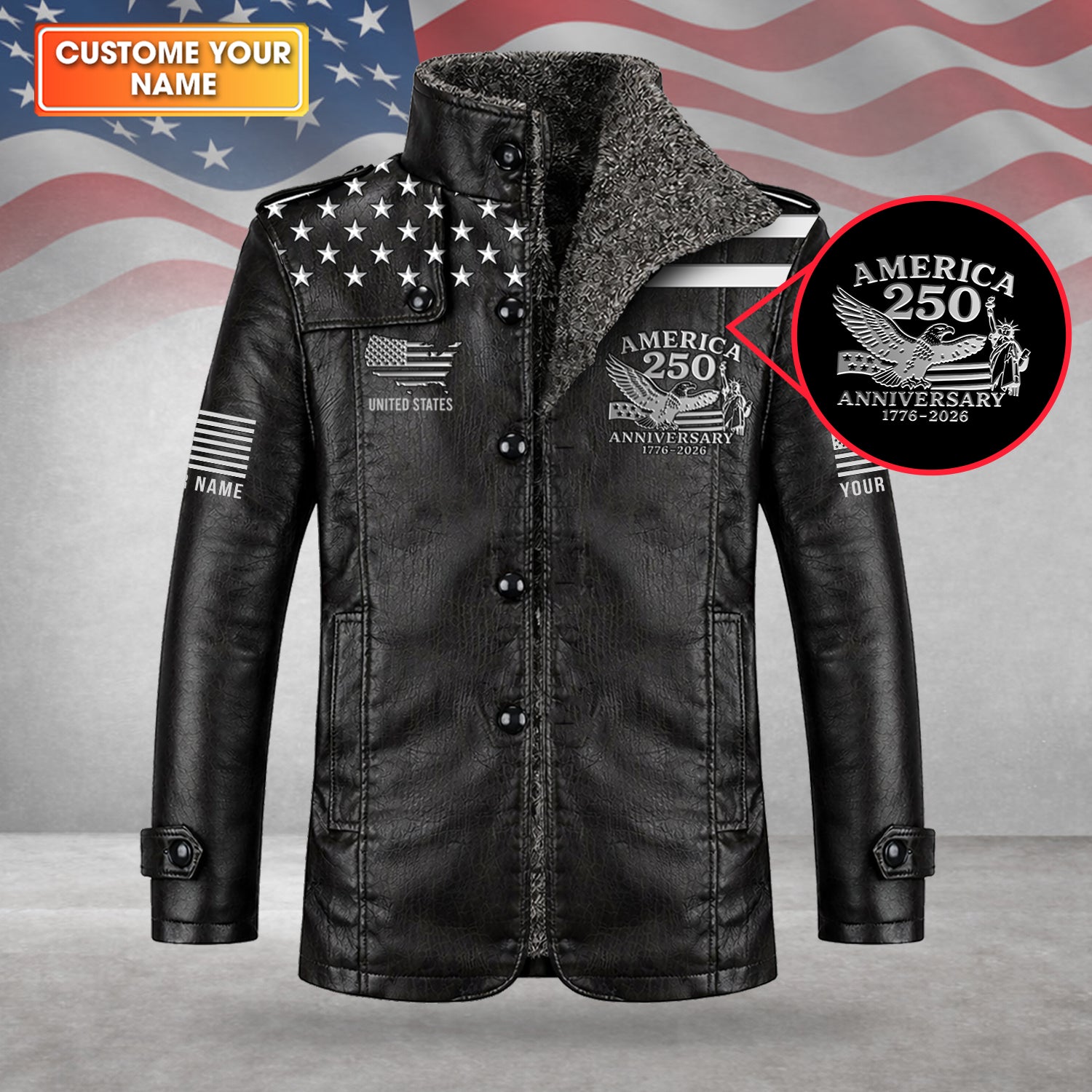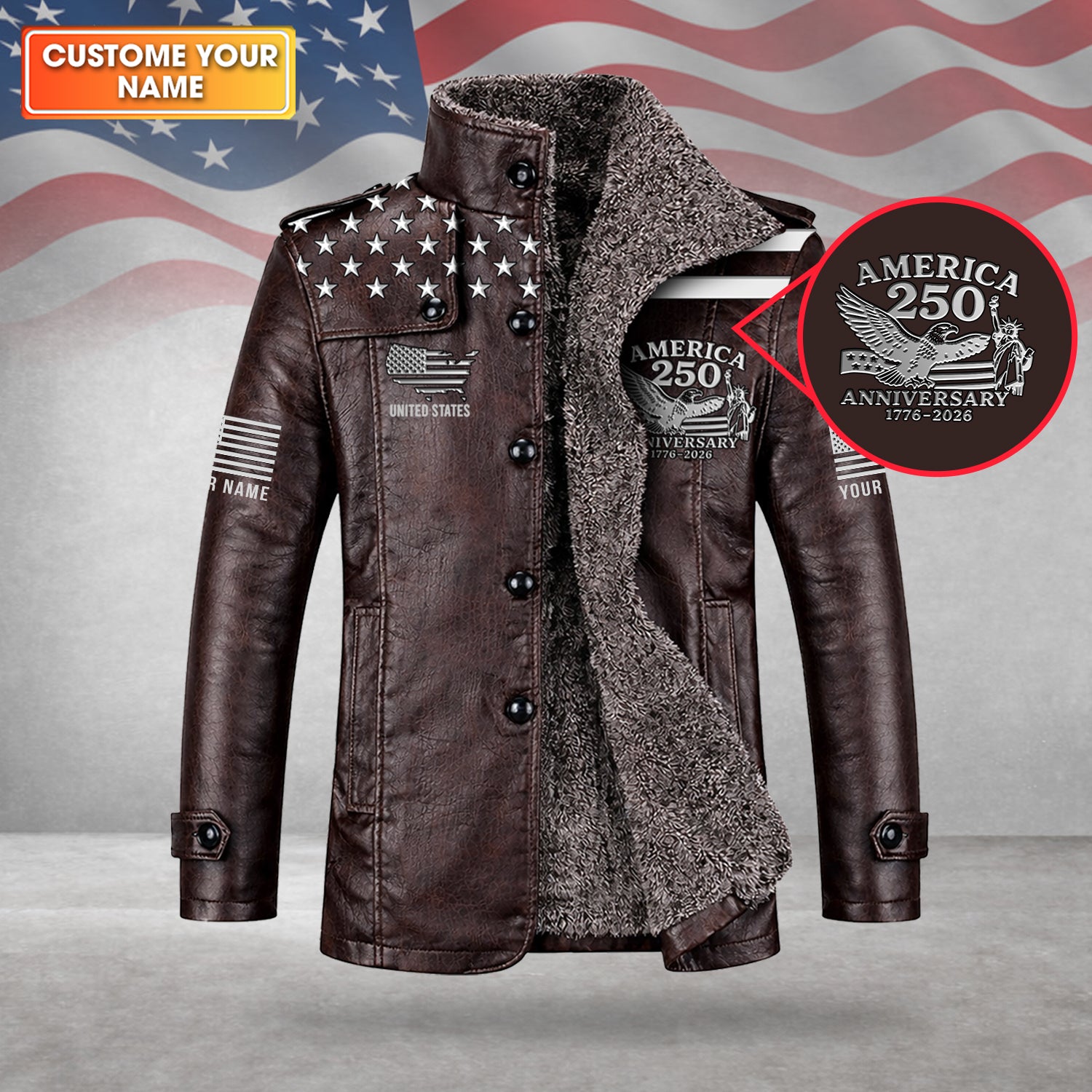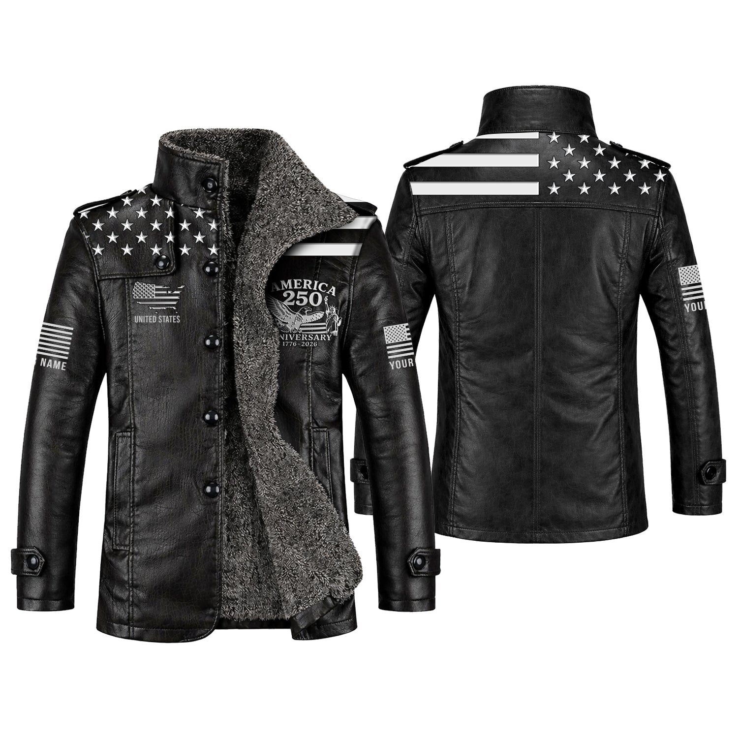 250 Years Red White Blue USA Flag Pattern Men's Cold Premium Weather Jacket, Leather Trench Coat