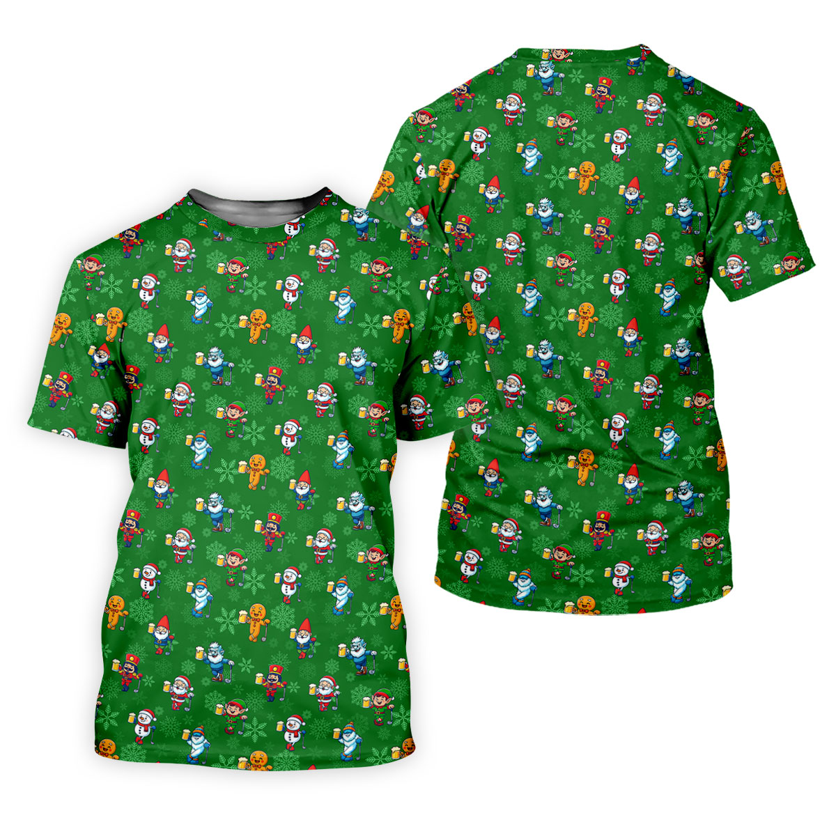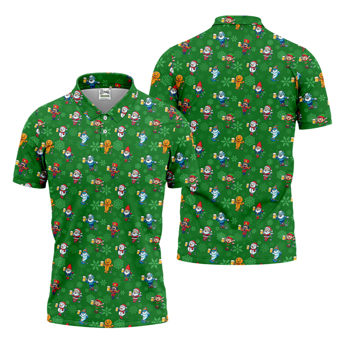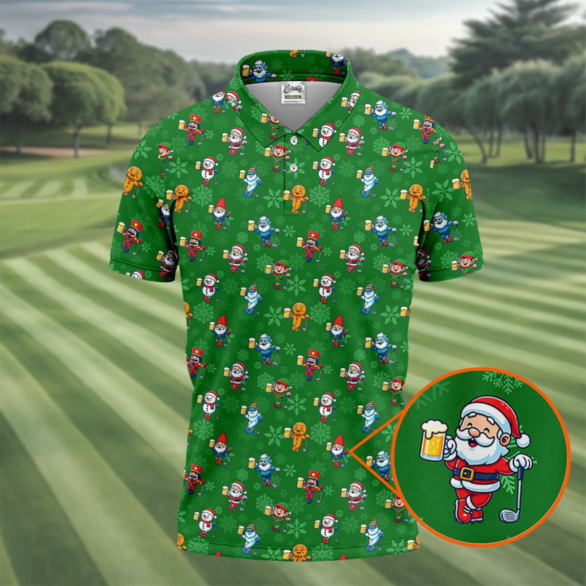Christmas Characters Golf And Beer Green Men's Funny Golf Shirts, Christmas Golf Shirt, Polo Shirts For Men