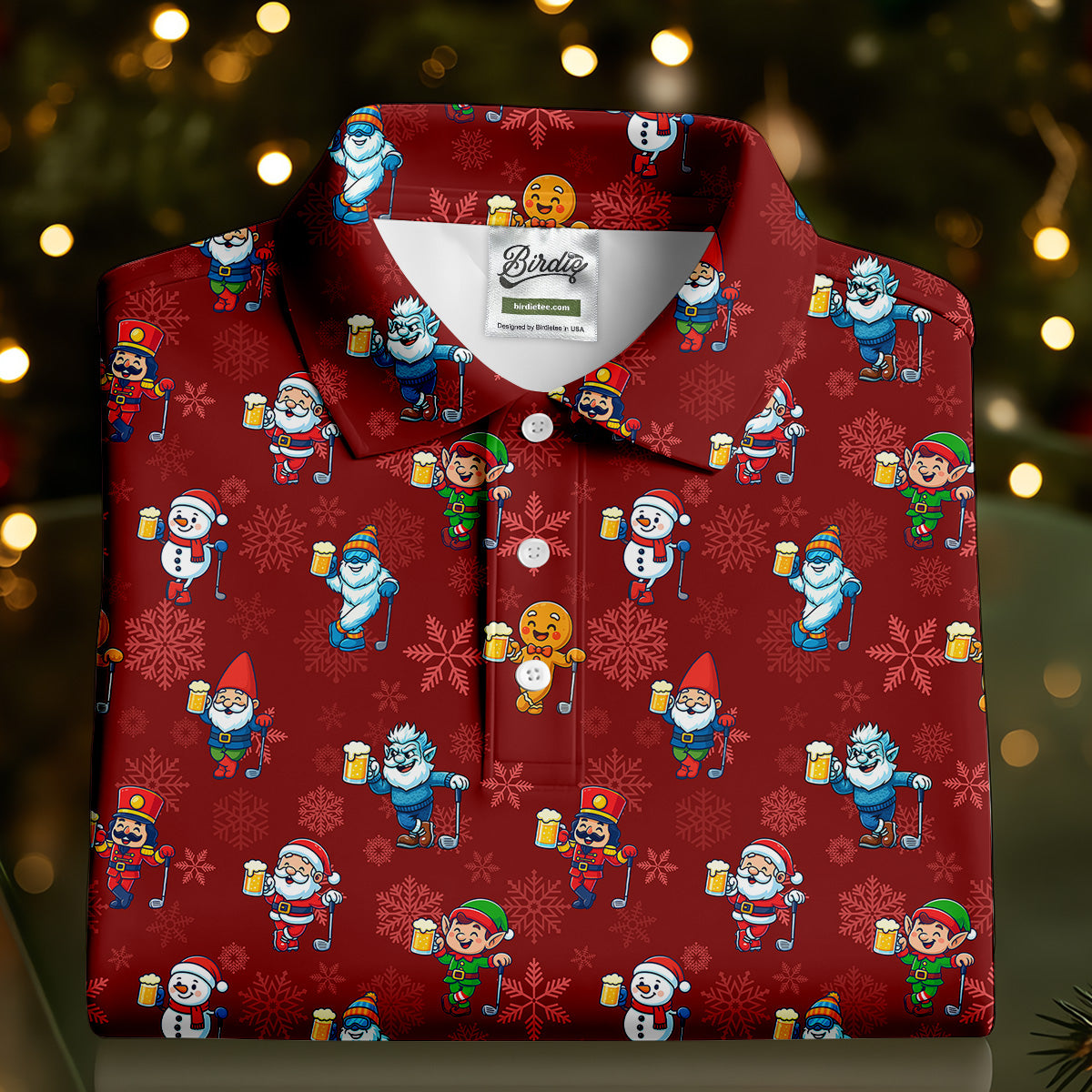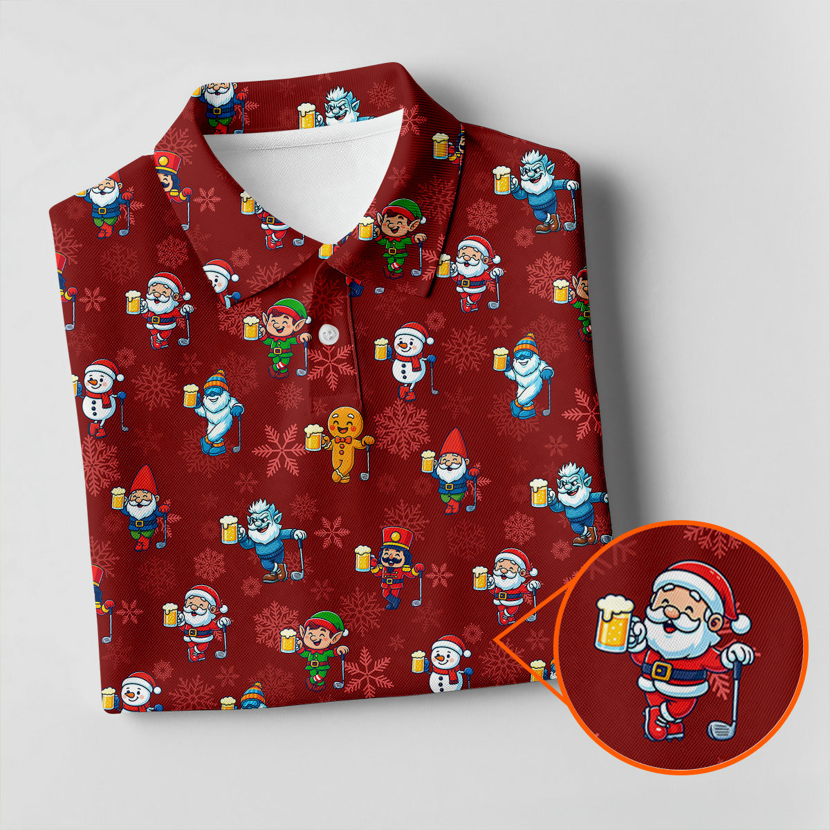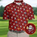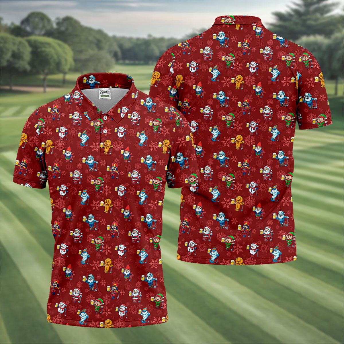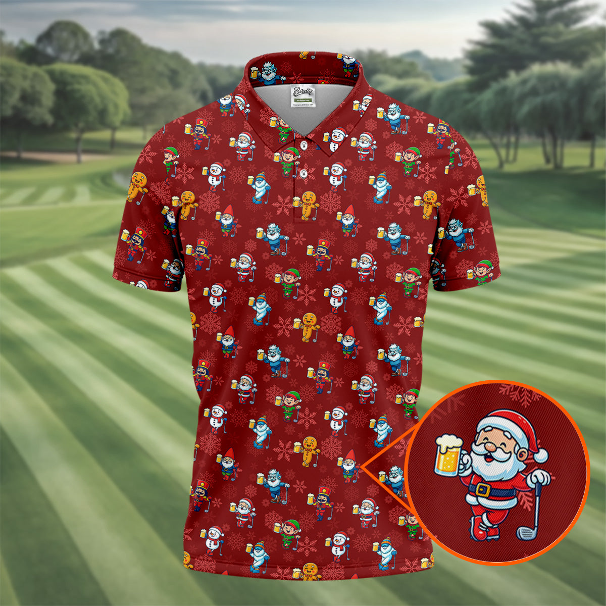 Christmas Characters Golf And Beer Red Men's Funny Golf Shirts, Christmas Golf Shirt, Polo Shirts For Men