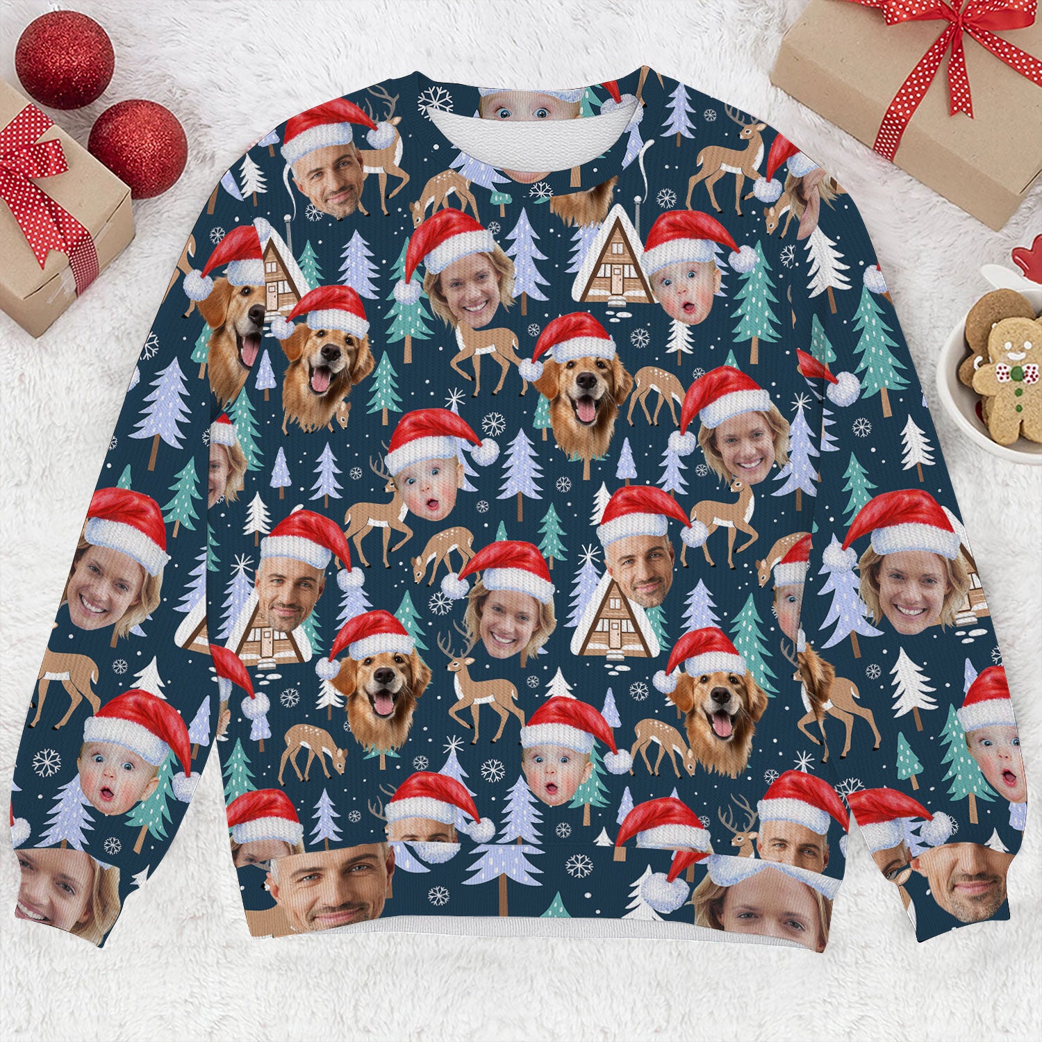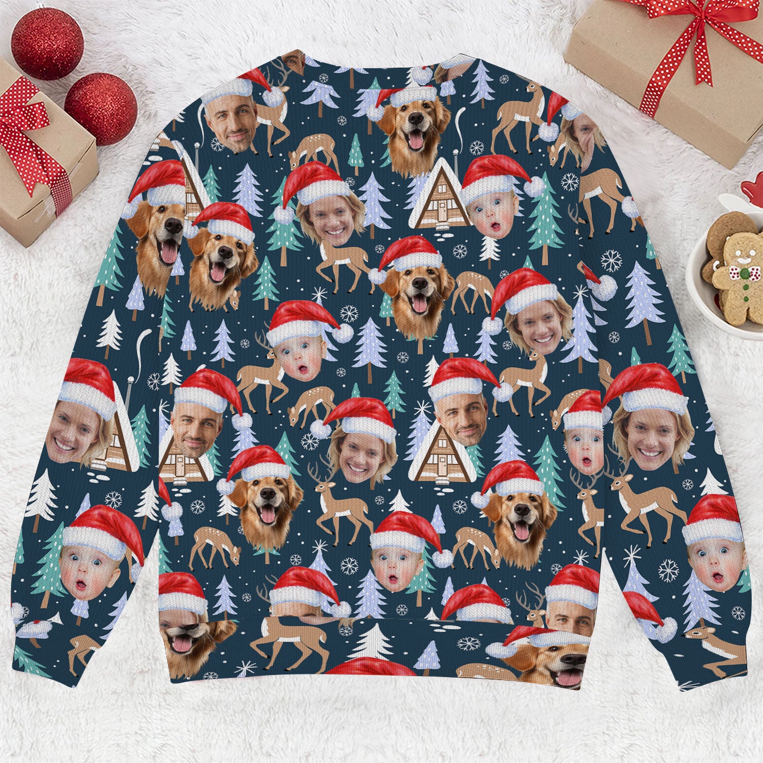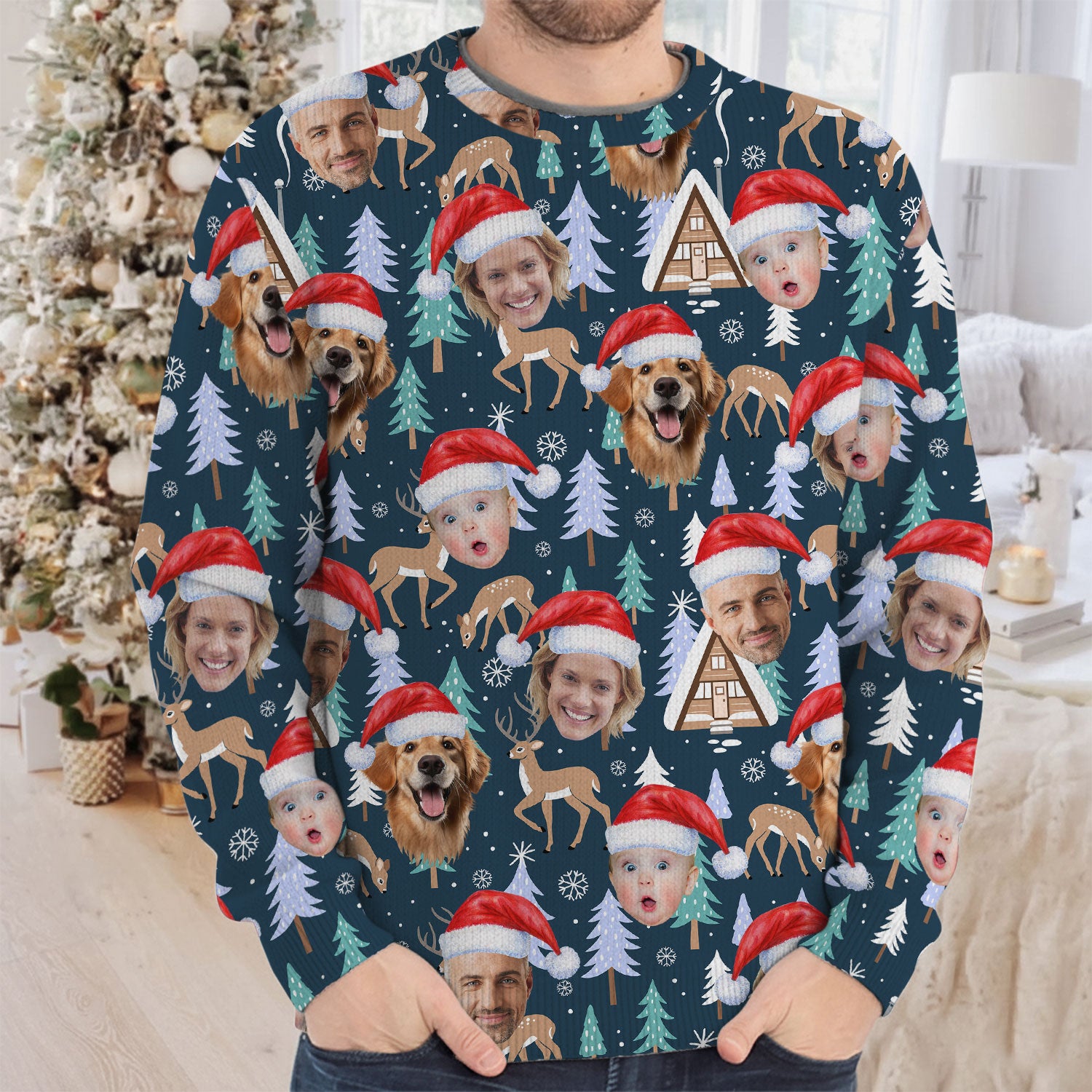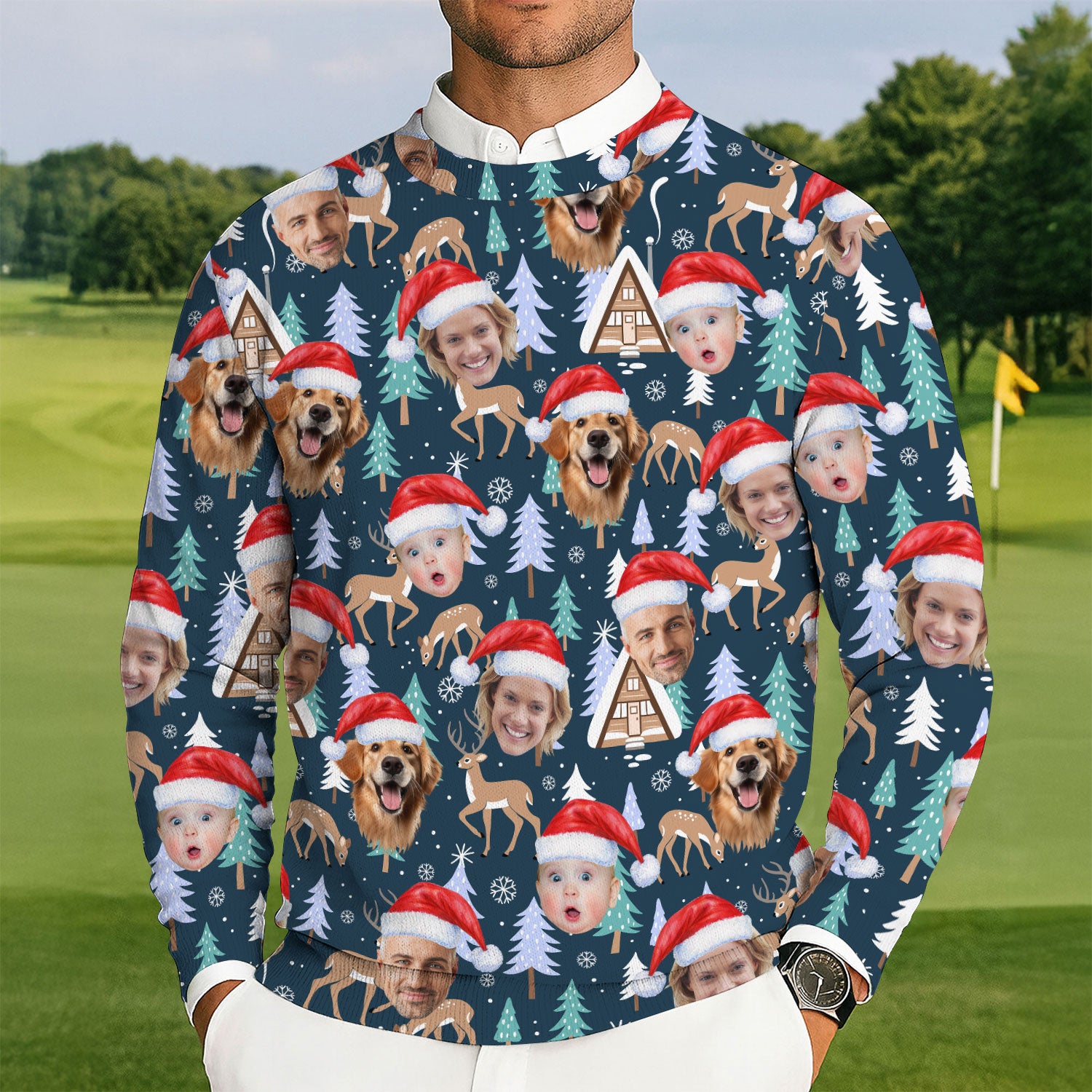 Custom Face Pine Tree Reindeer Dark Teal Green Golf Ugly Sweater, Christmas Golf Shirt, Golf Sweater