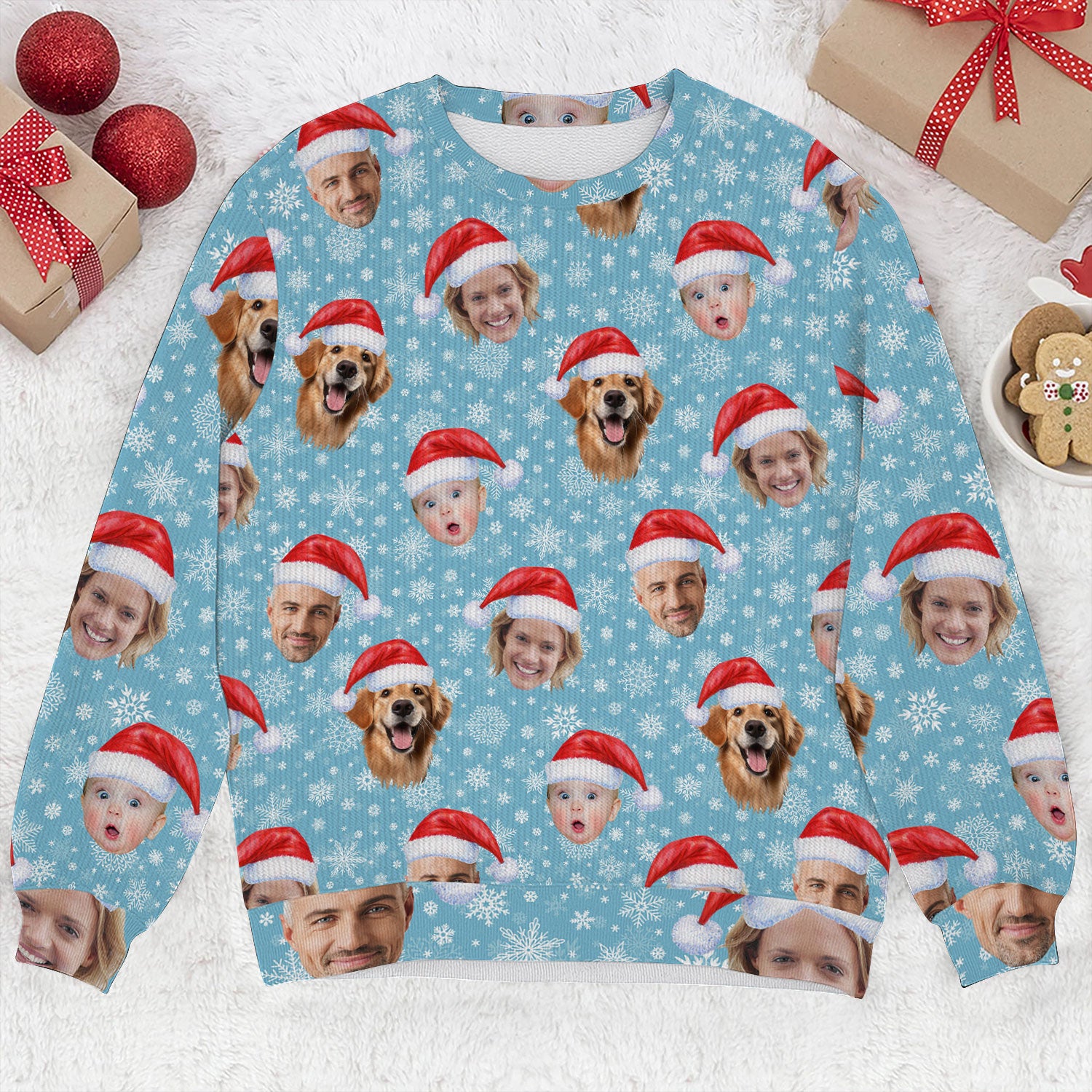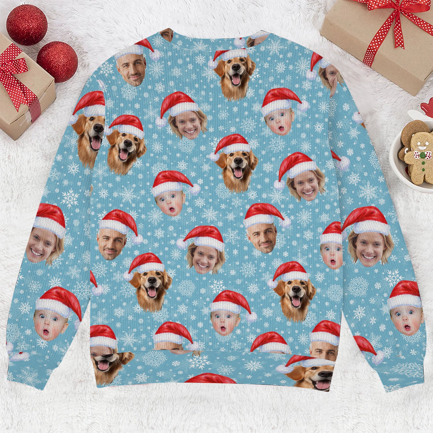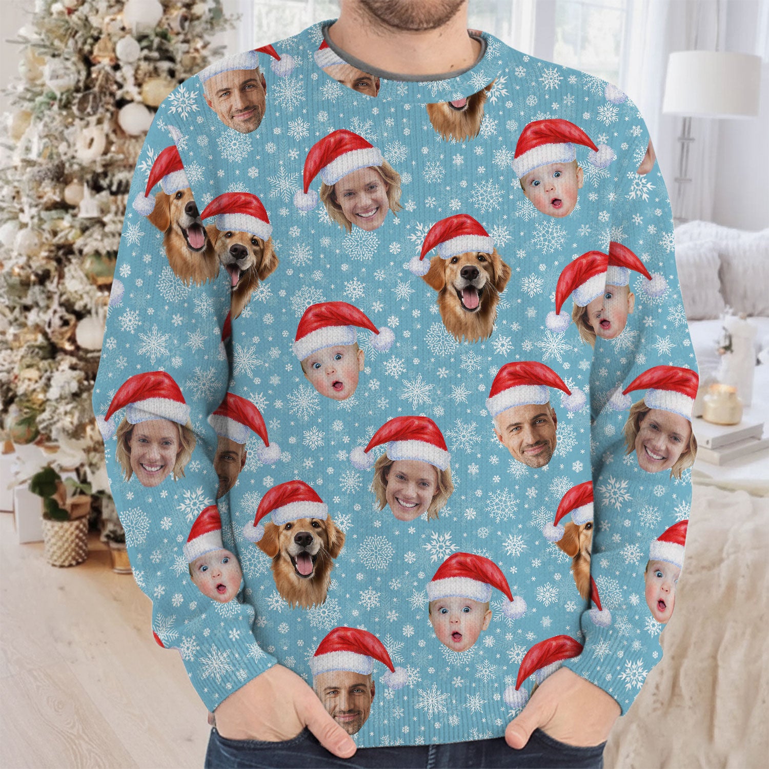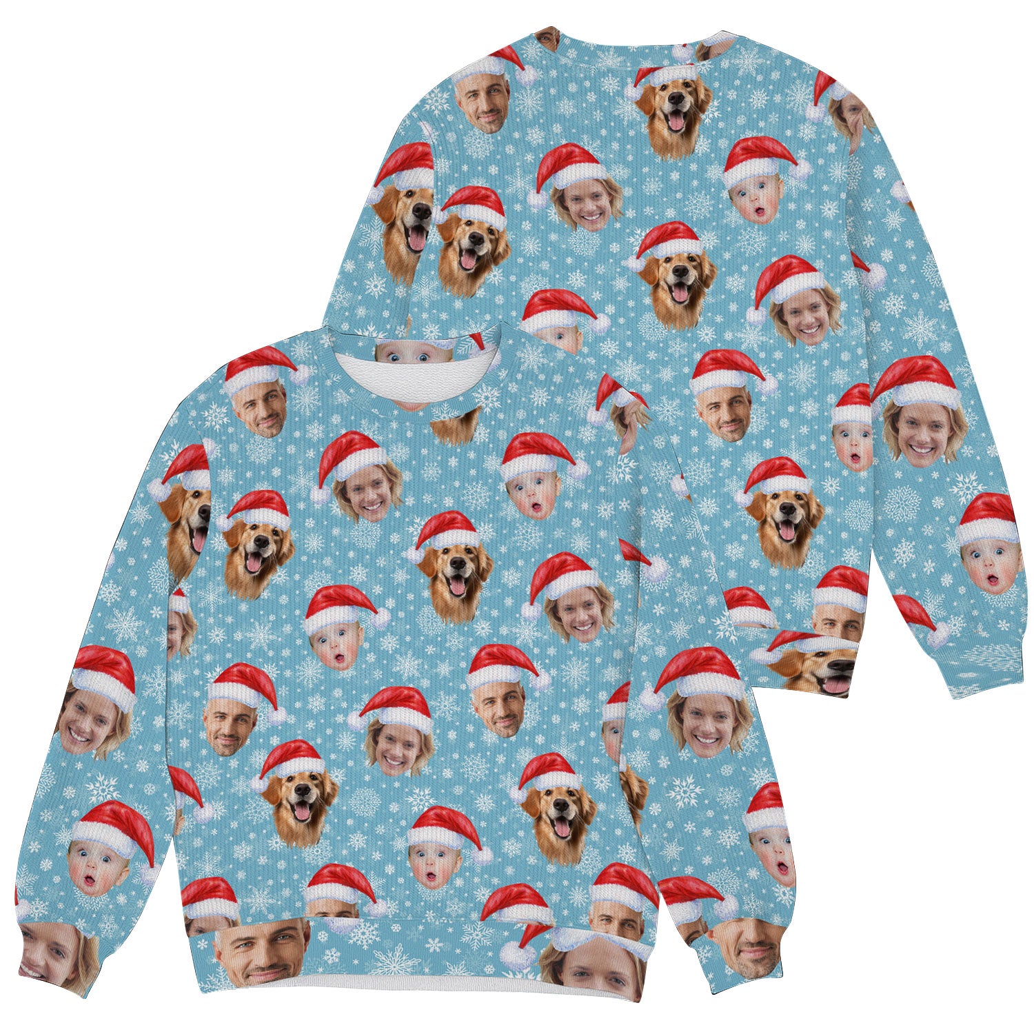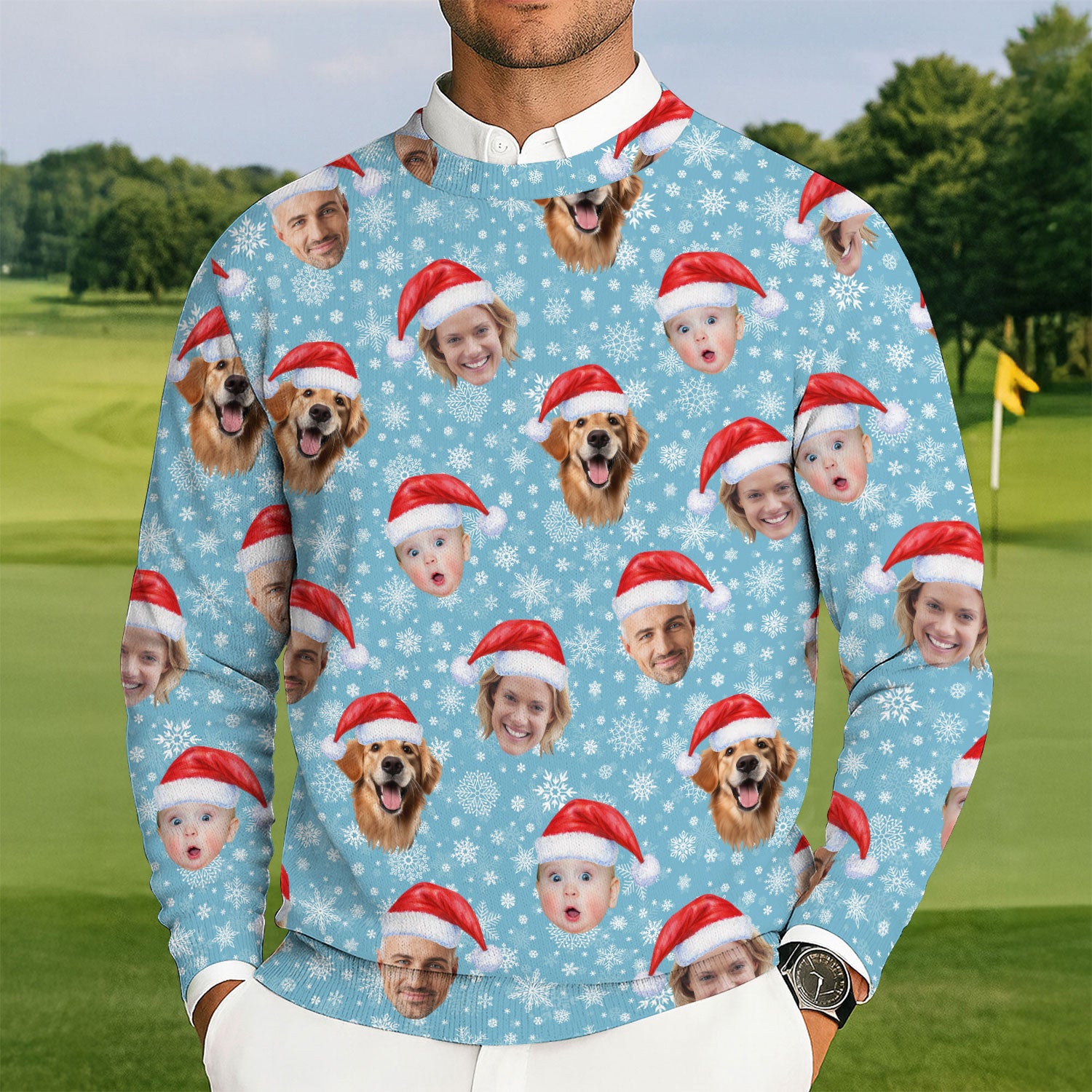 Custom Face Snowflakes Print Ice Blue Golf Ugly Sweater, Christmas Golf Shirt, Golf Sweater, Christmas Golf Gift