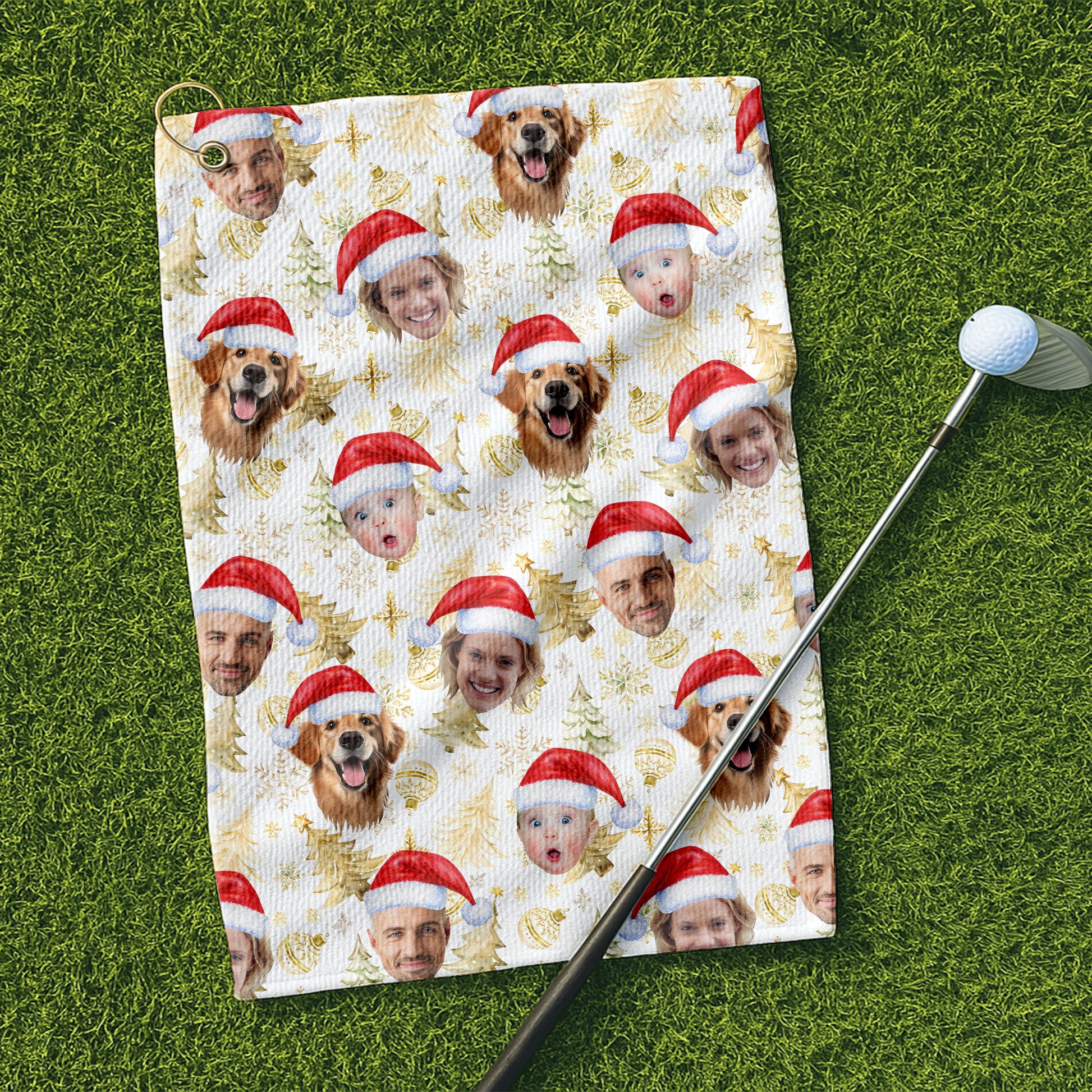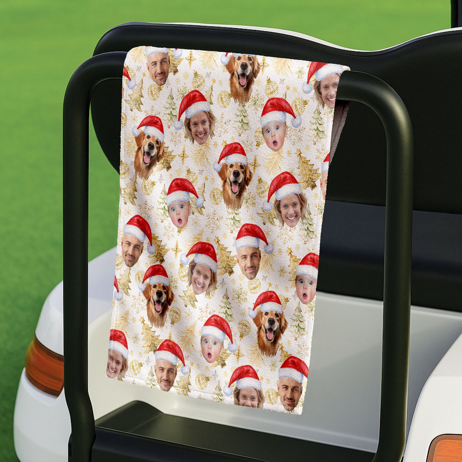 Custom Face Xmas Pattern Golden Print Golf Towels, Christmas Golf Gift, Custom Golf Accessories