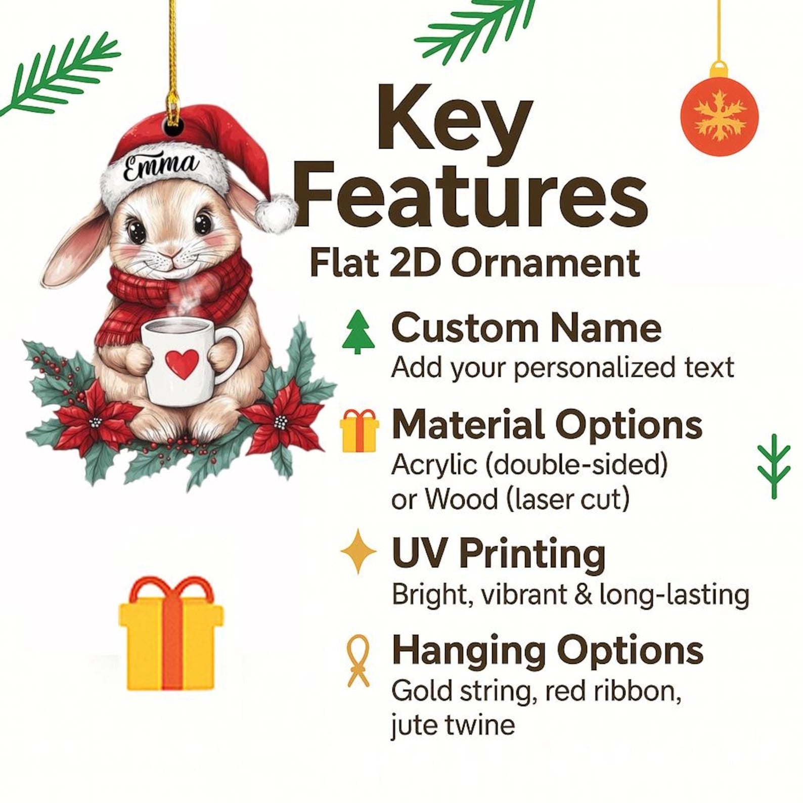 CHRISTMAS DECORATION: Hanging the personalized ornament on your Christmas tree or sending to families and friends as a holiday gift, it will be a perfect way to create lasting, loving memories. It comes with a hole and a metal wire for easy hanging.