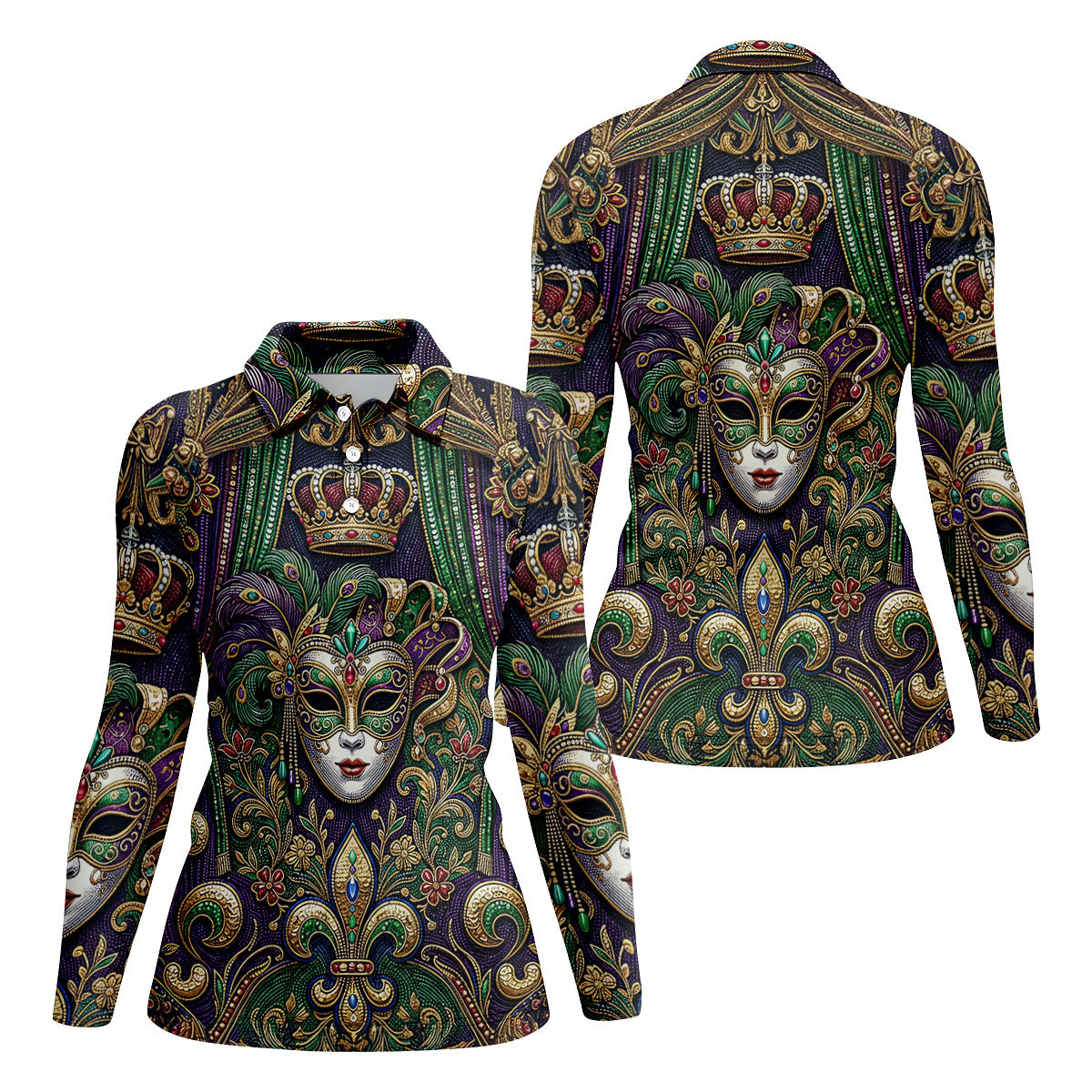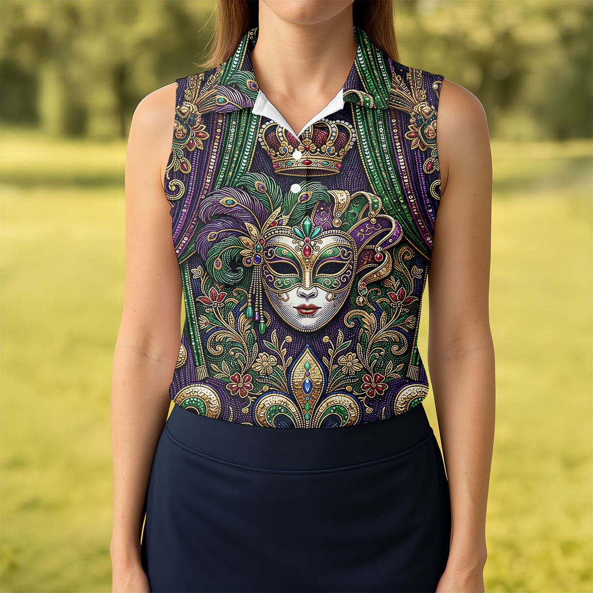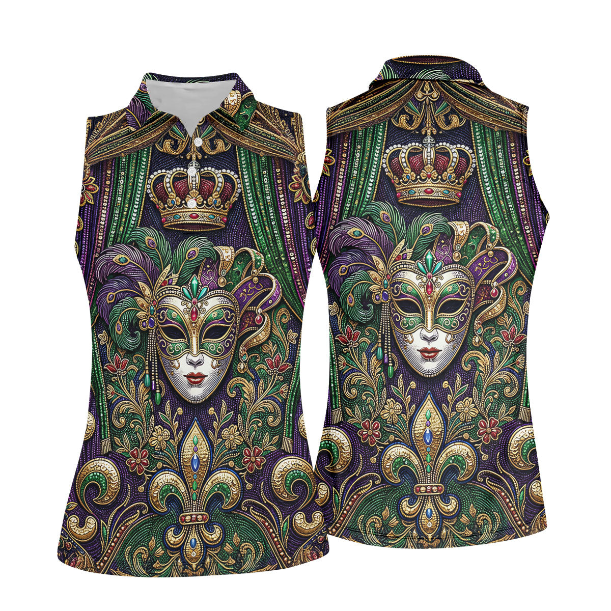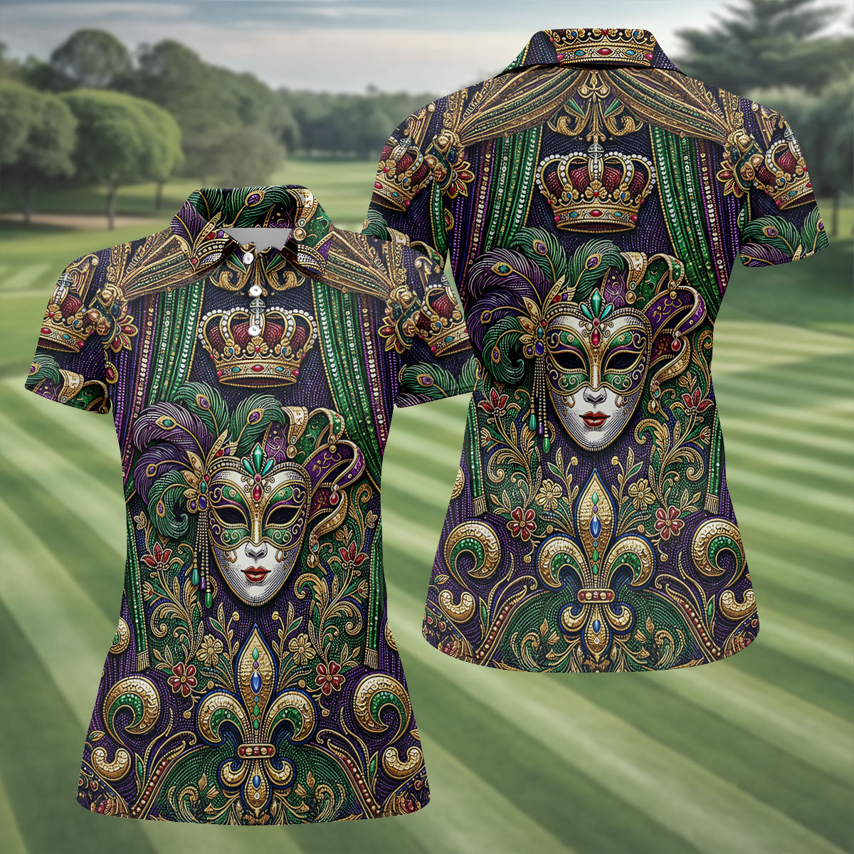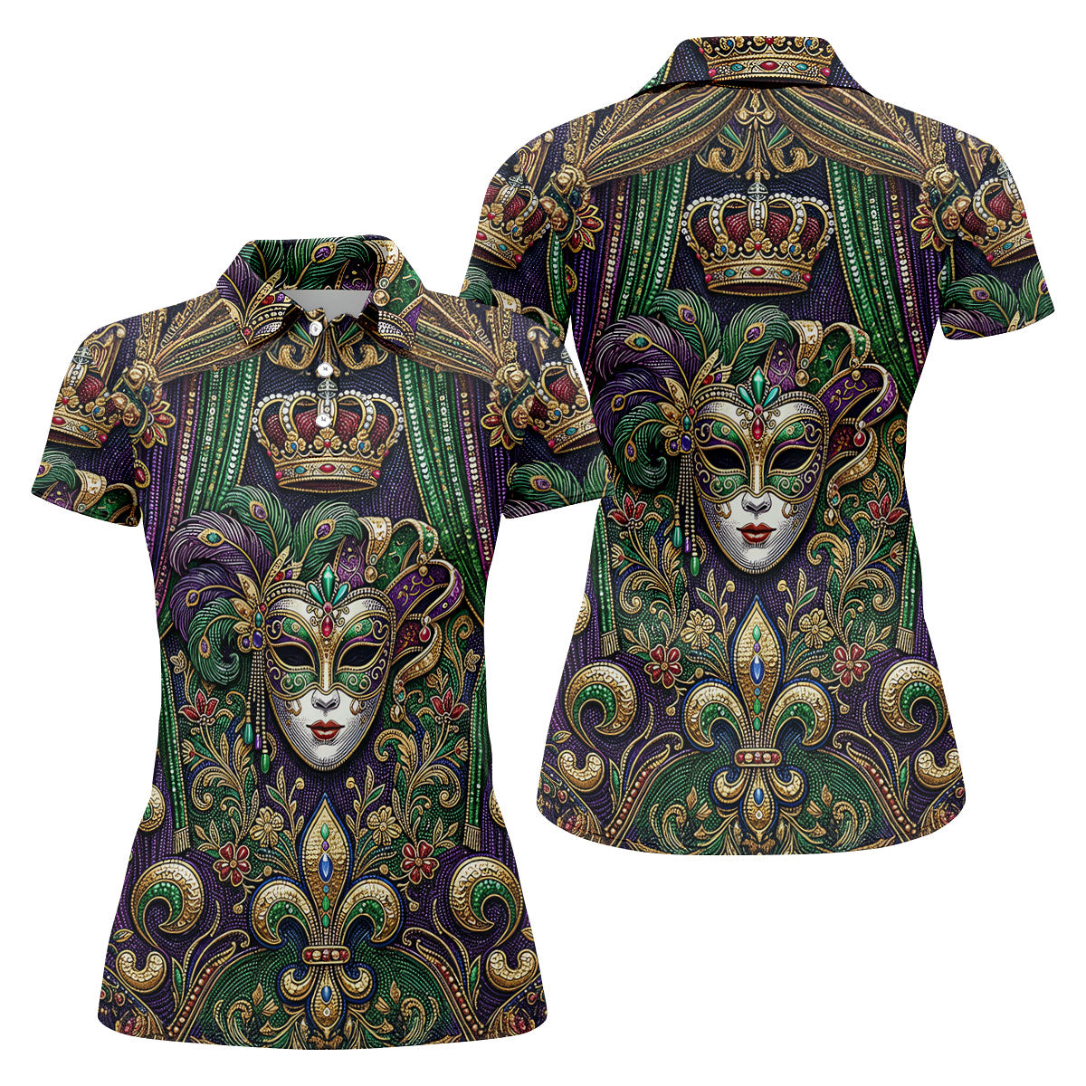 Fleur De Lis Floral Crown Mardi Gras Mask Print Women's Golf Tops, Ladies Golf Shirts, Ladies Golf Polos