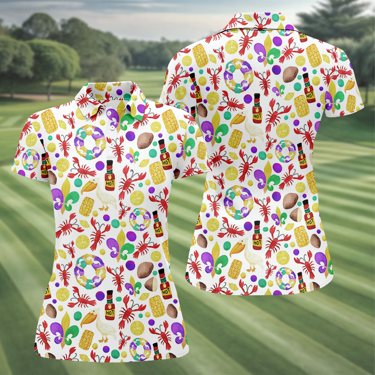 Fleur De Lis Flower White Pelican Lobster Hot Sauce Mardi Gras Golf Shirt, Women Golf Top, Ladies Golf Polos