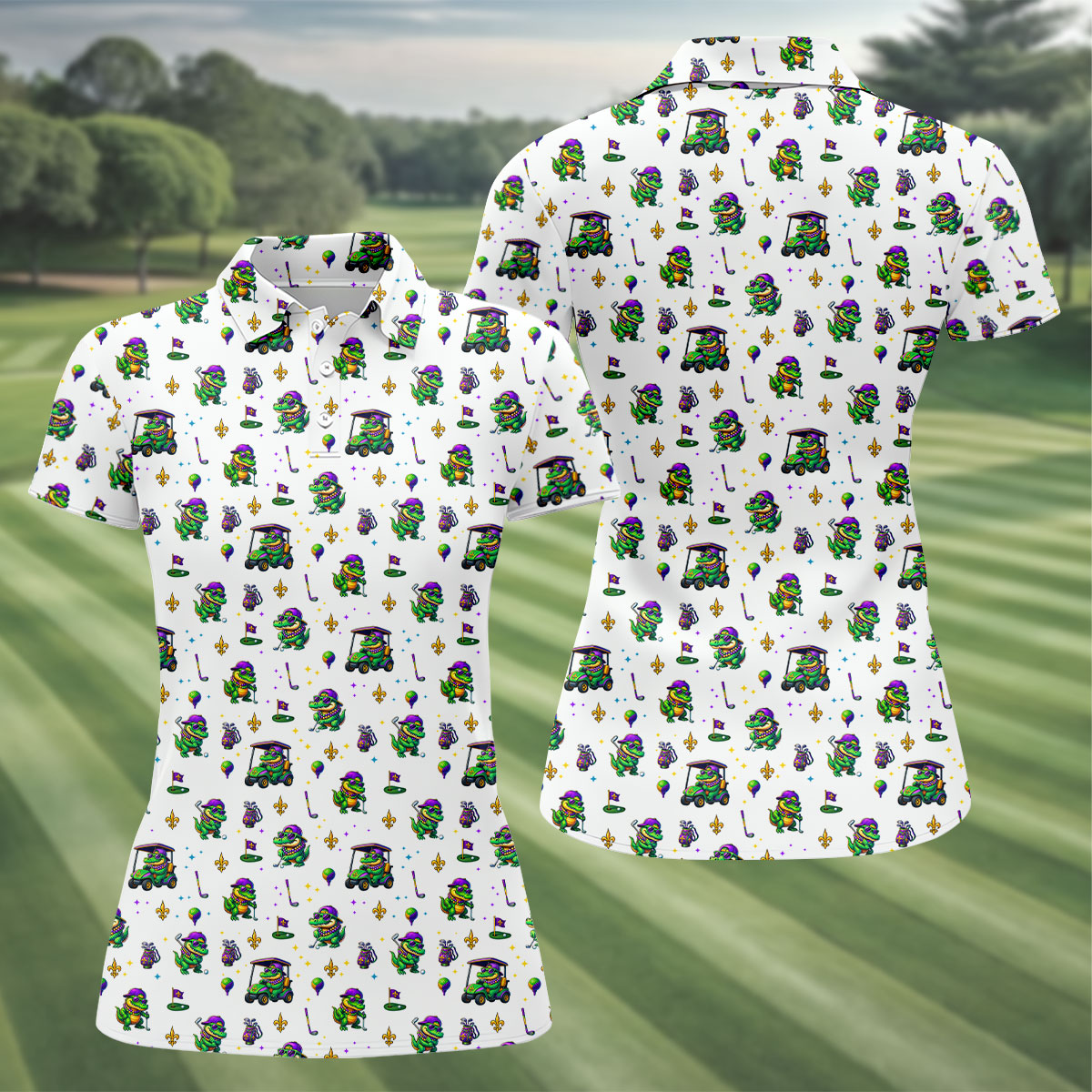 Funny Crocodile Mardi Gras Golf Shirts, White Golf Shirt, Festive Women Golf Top, Ladies Golf Shirts