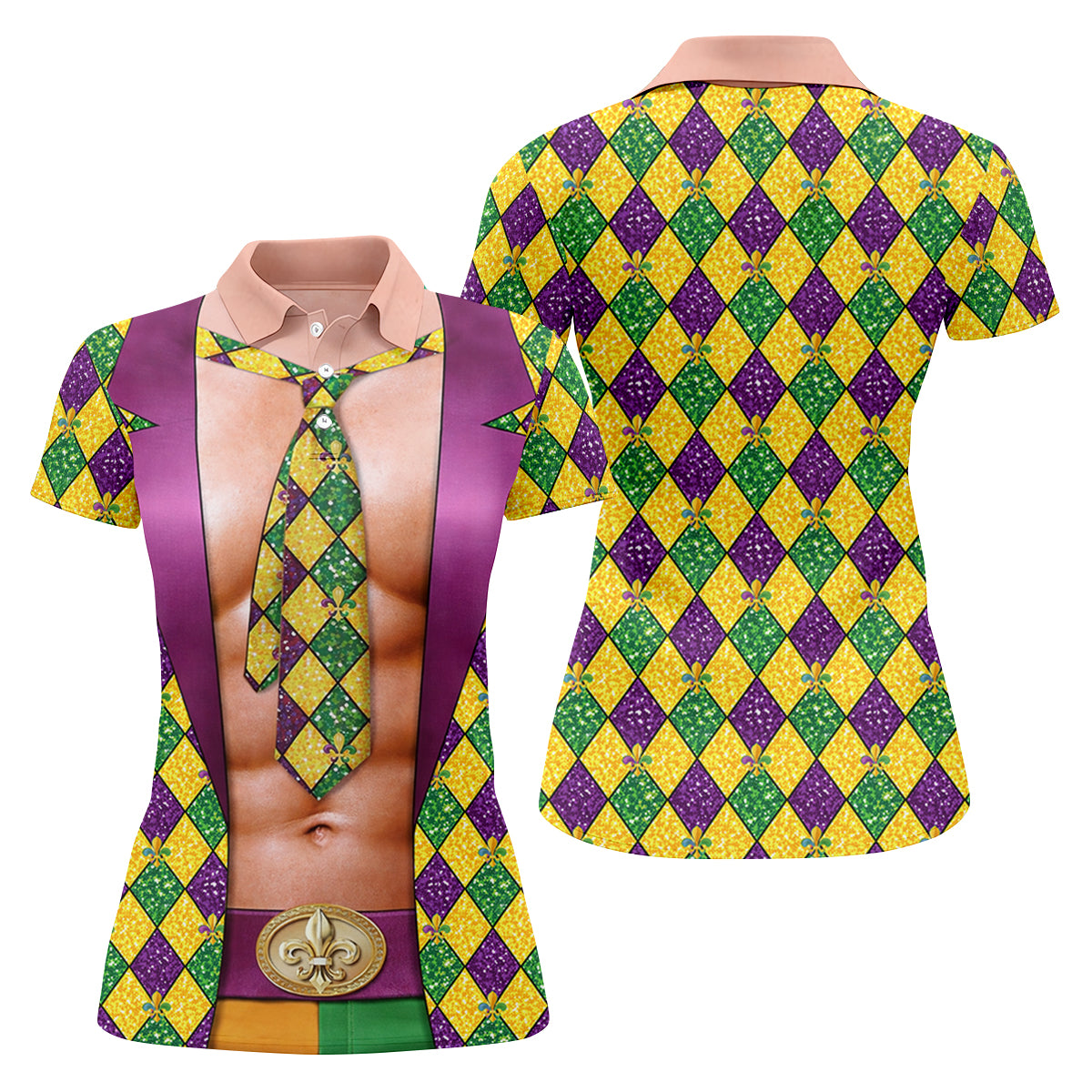 Green Purple Gold Argyle Pattern Fun Suit Mardi Gras Print Golf Shirt, Fun Women's Golf Shirts, Ladies Golf Polos