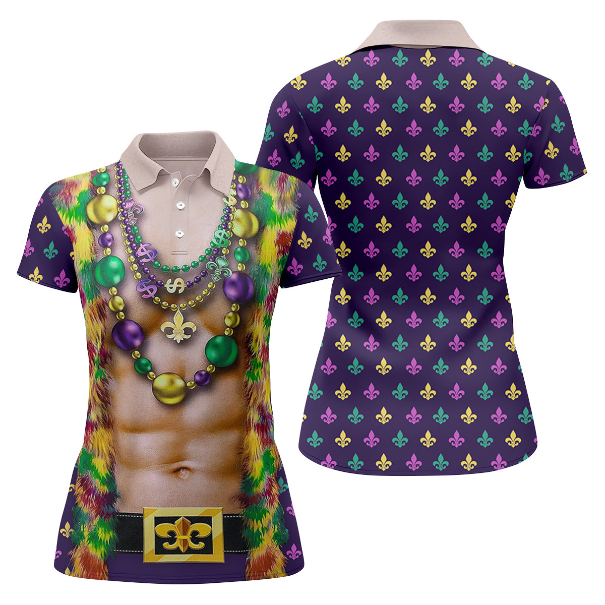 Green Purple Gold Fleur De Lis Symbol Fun Suit Mardi Gras Print Golf Shirt, Fun Women's Golf Shirts, Ladies Golf Polos
