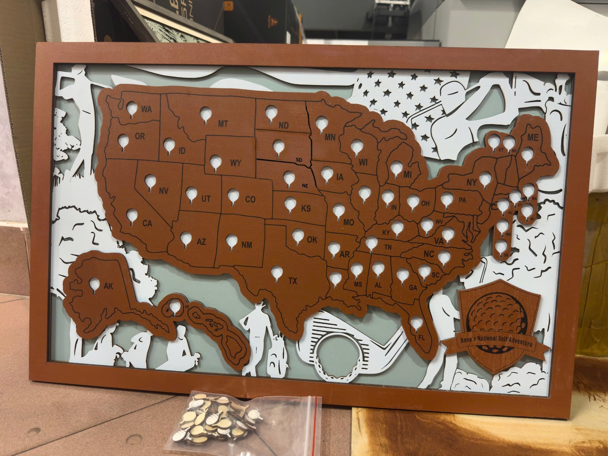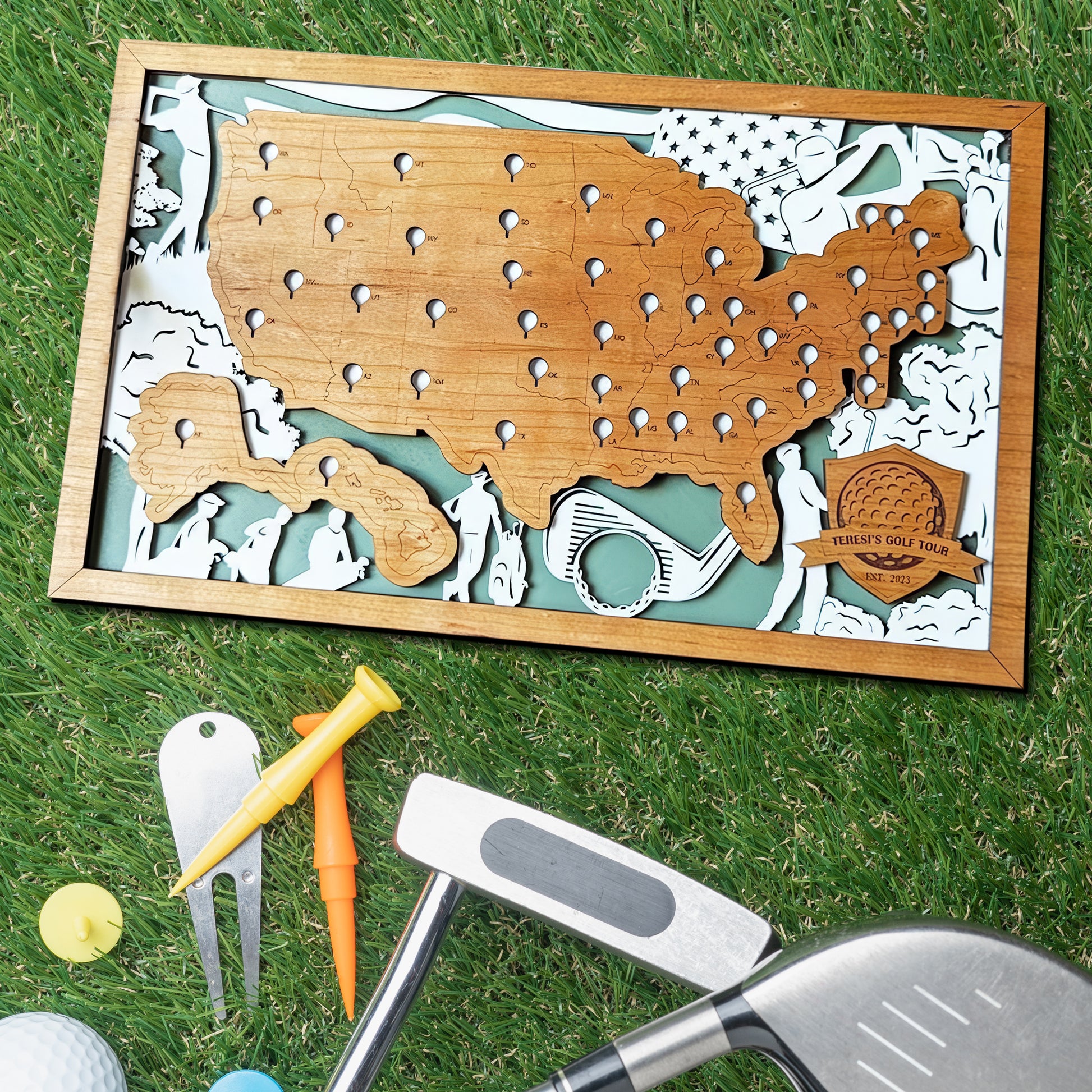 Perfect for golf enthusiasts and travelers alike, it’s an artistic way to display the courses you’ve played and the ones still on your bucket list.