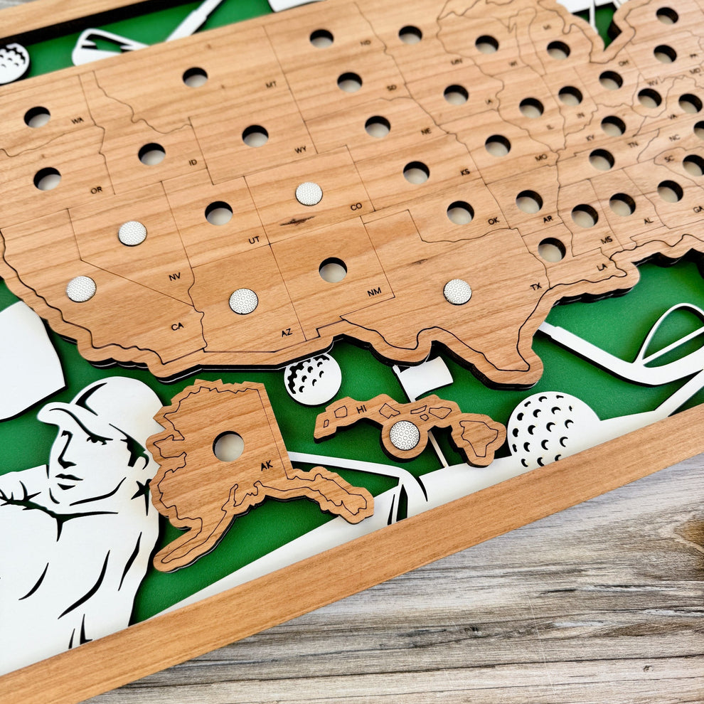 With our custom engraved badge, your wood map becomes a storyteller, weaving the tale of your golf journey across the America. From the first tee to that satisfying putt on the 18th green, you’ve earned the right to brag – now let your map do the talking!