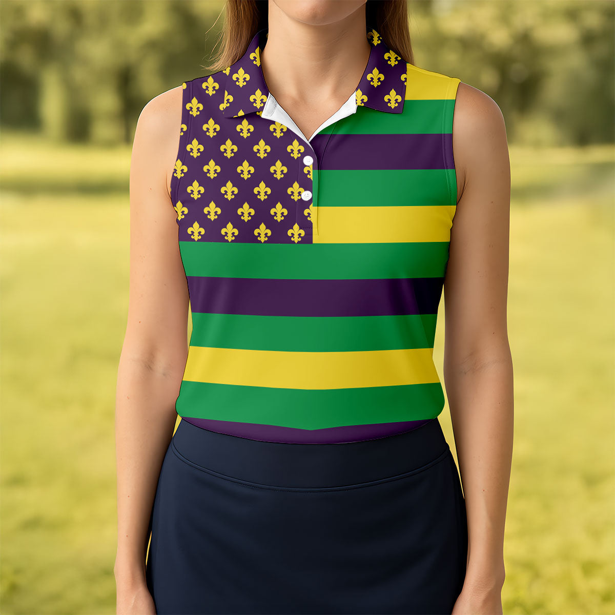 Mardi Gras Flags Fleur De Lis Purple Green Gold Ladies Golf Tops, Women's Golf Tops, Ladies Golf Polos