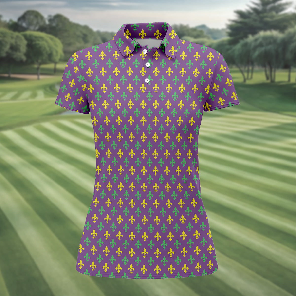 Mardi Gras Theme Green Purple Gold Fleur De Lis Pattern Women's Golf Tops, Golf Gift For Ladies