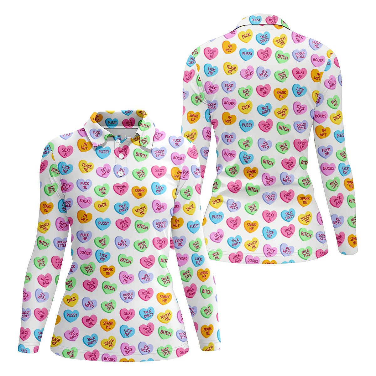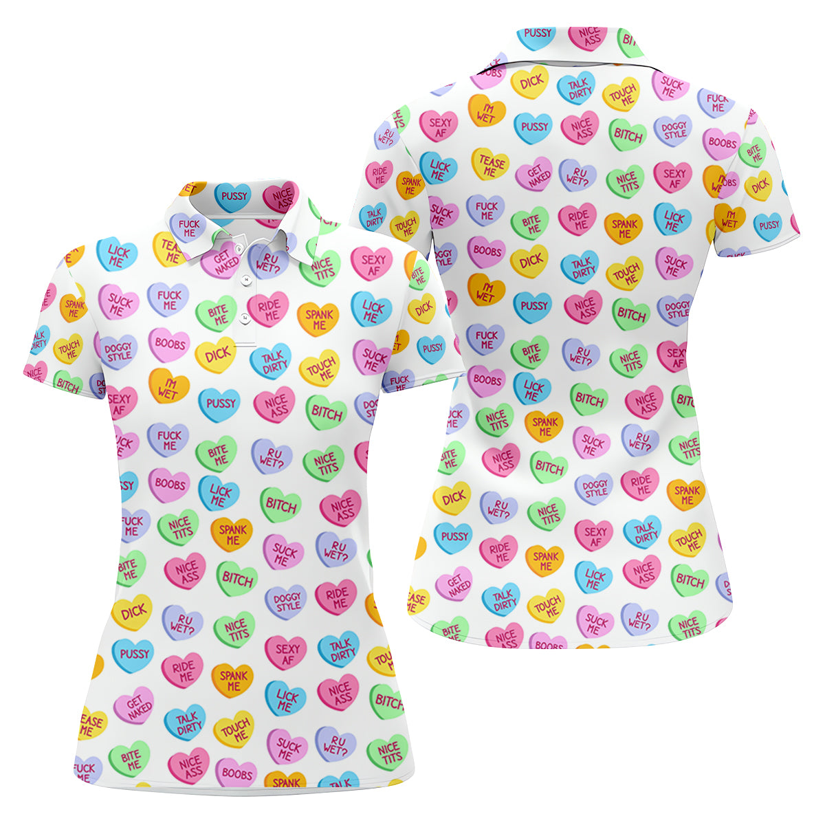 Naughty Conversation Hearts Fun Women's Golf Shirts, Valentines Golf Gift, Dirty Candy Heart Ladies Golf Polos