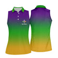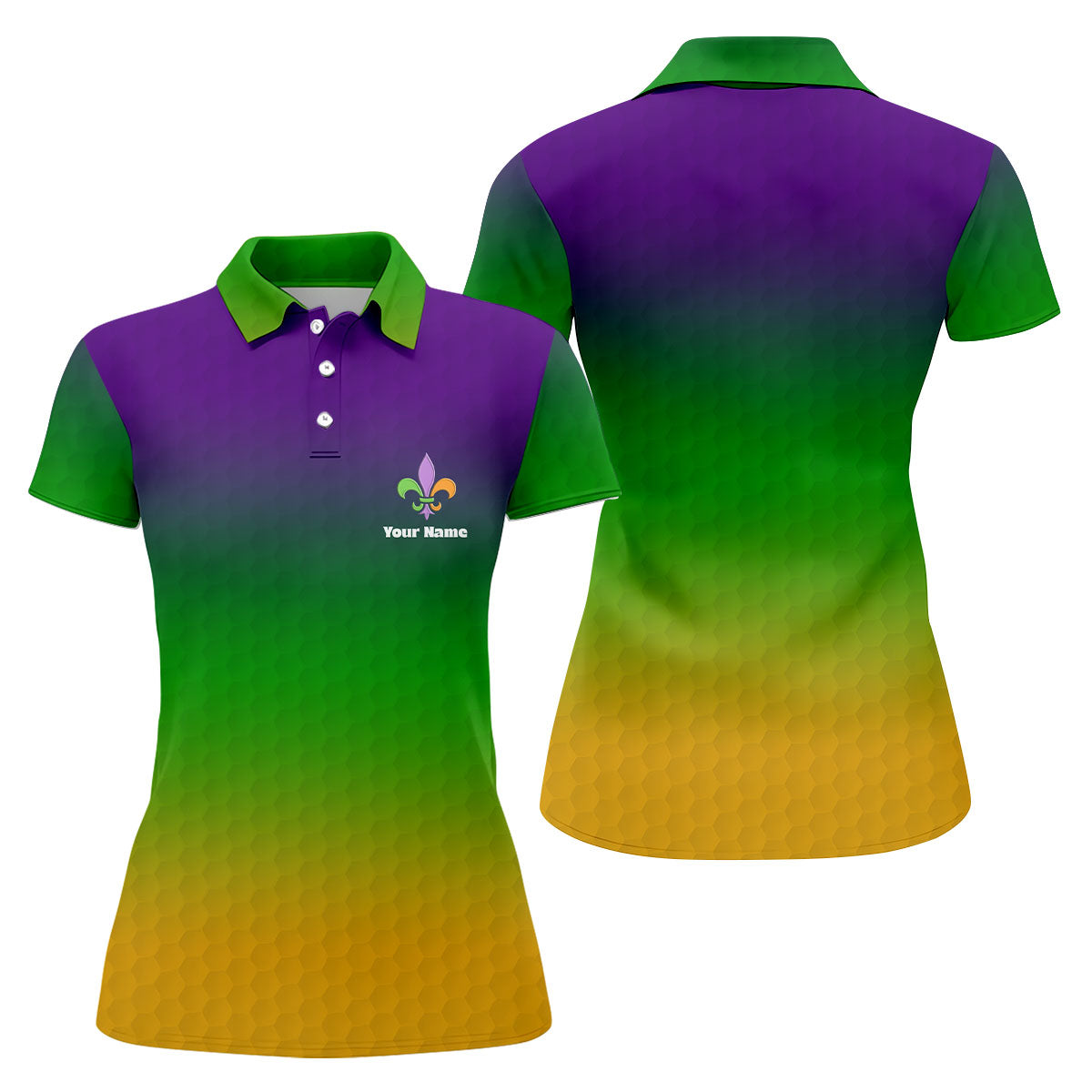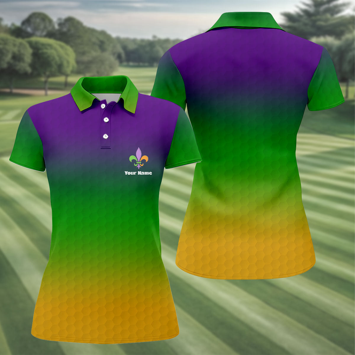 Mardi Gras Purple Gold Green Blended Color Golf Ball Pattern Women's Golf Tops, Women's Golf Shirts, Ladies Golf Polos
