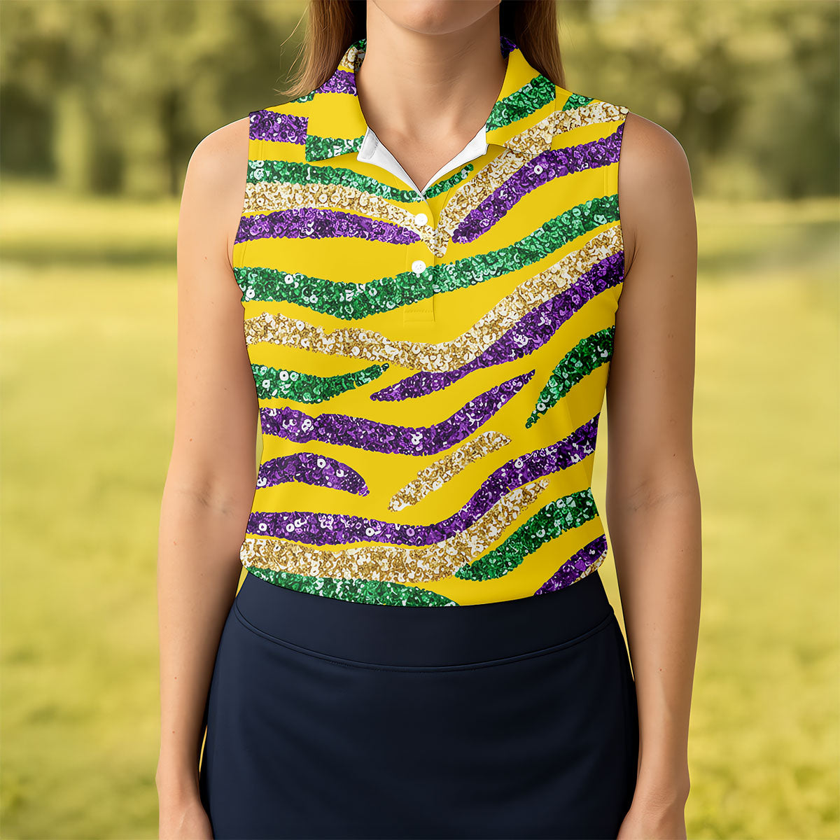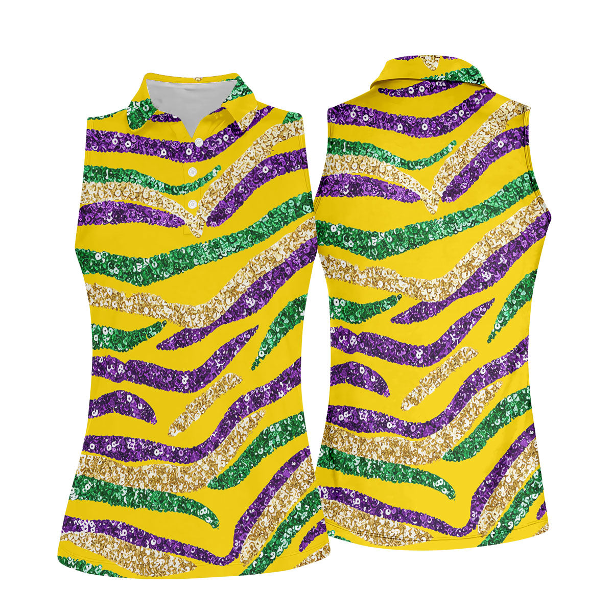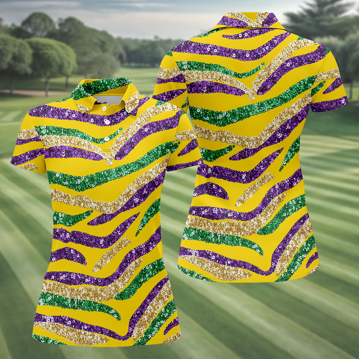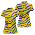 Purple Green Gold Sequin Pattern Yellow Golf Shirt, Mardi Gras Golf Shirt, Women's Golf Tops, Ladies Golf Shirts