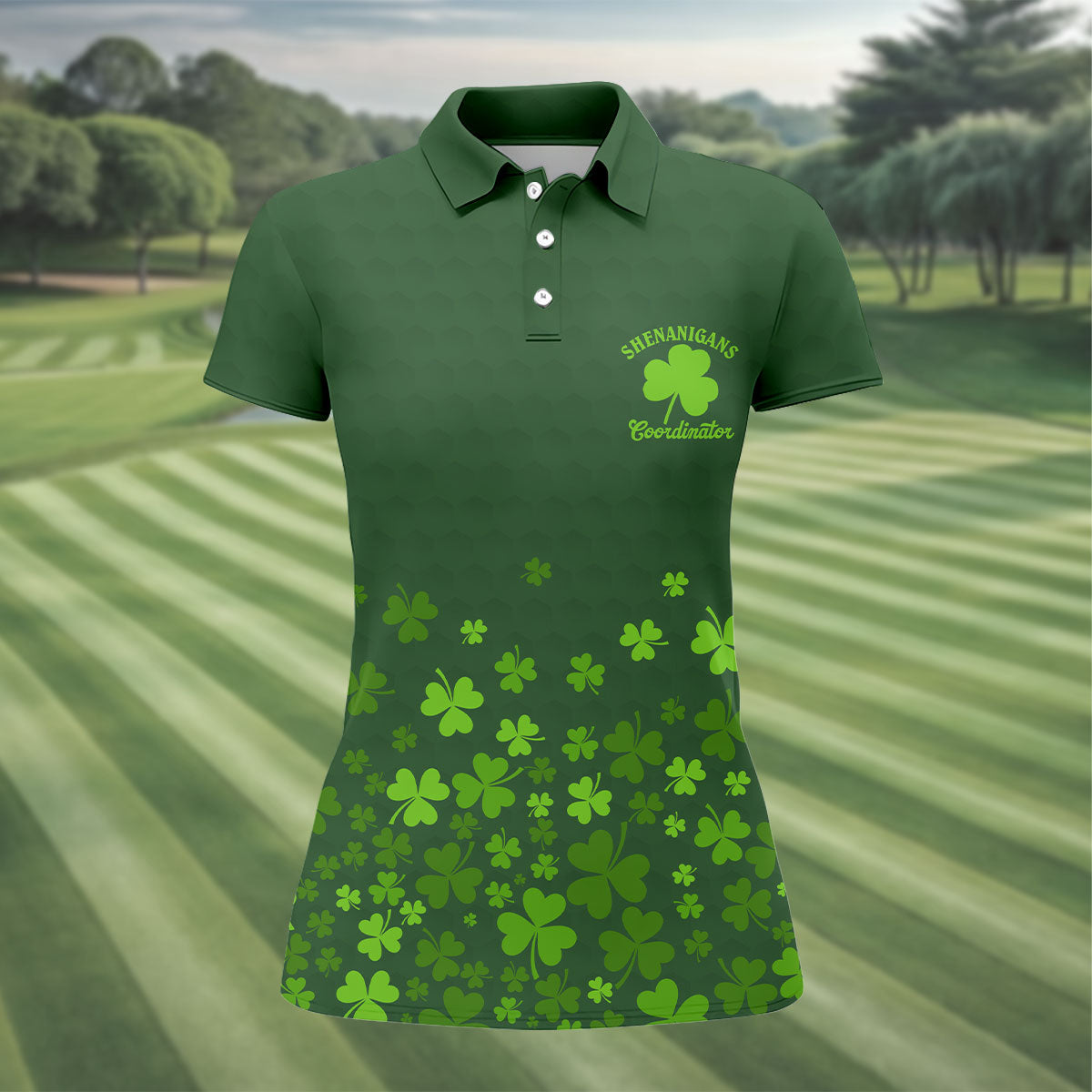 Shenanigans Coordinator Golf Ball Pattern St Patrick Day Green Golf Shirt, Women's Golf Tops, Ladies Golf Polos