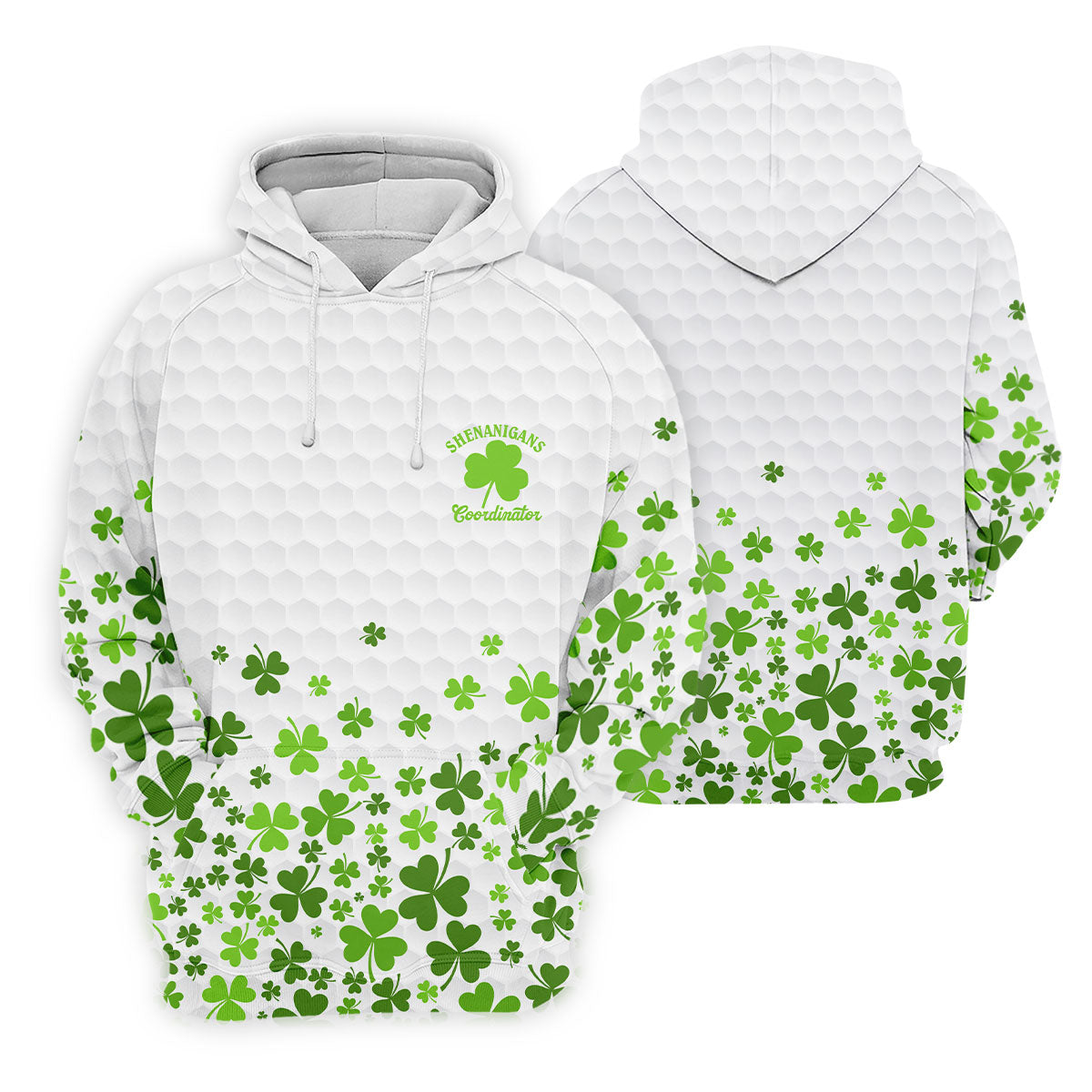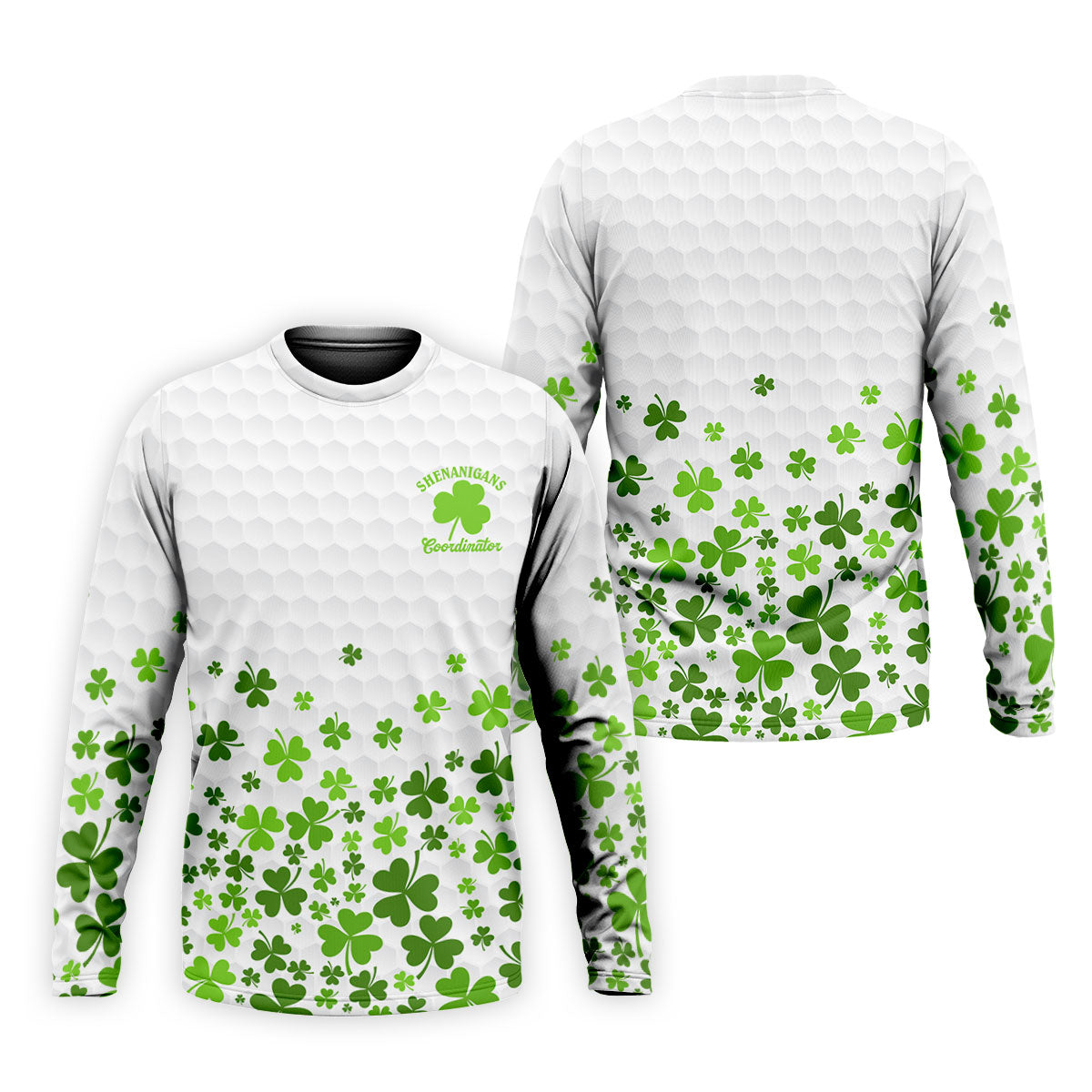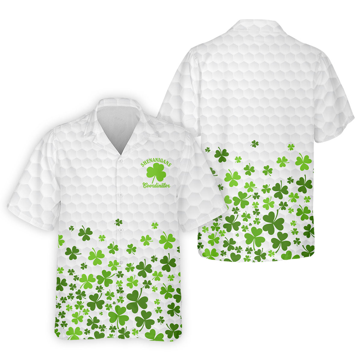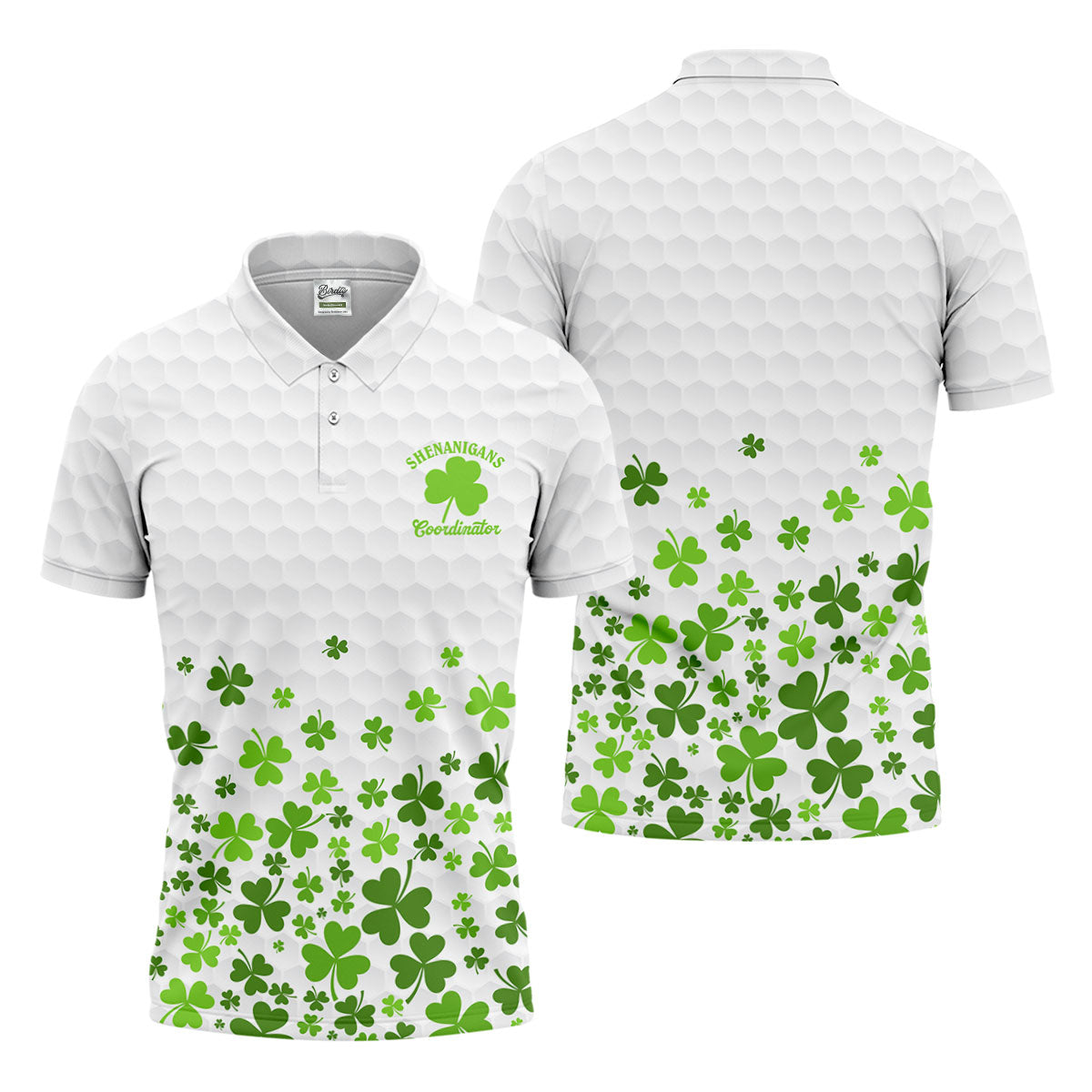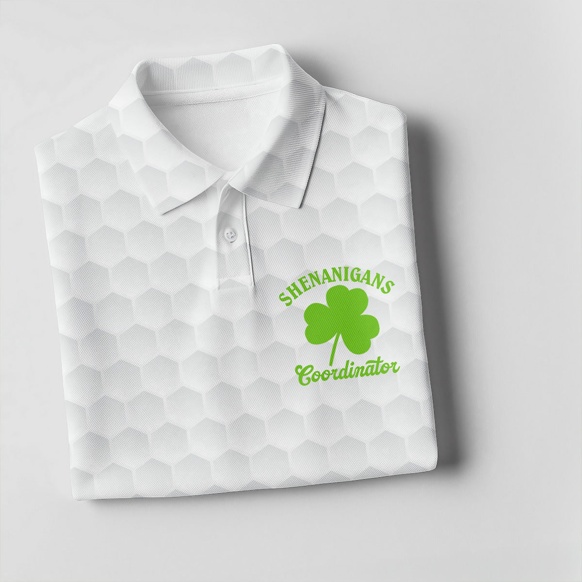 Shenanigans Coordinator Golf Ball Pattern St Patrick Day White Golf Shirt, Golf Tops For Men, Golf Shirts For Men