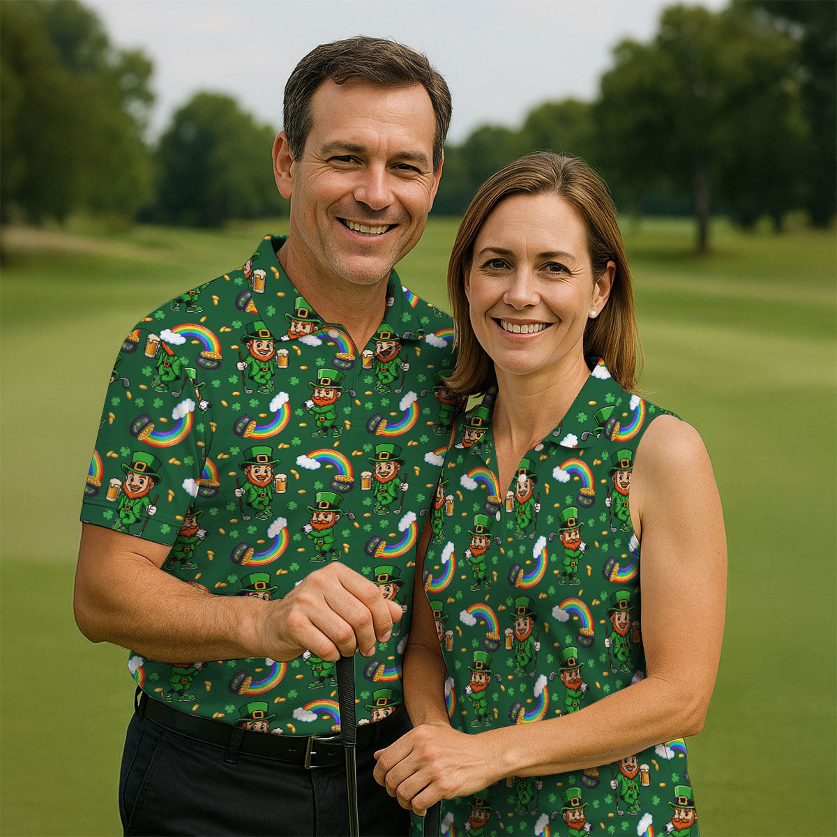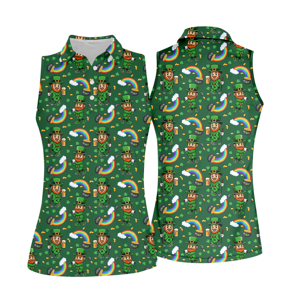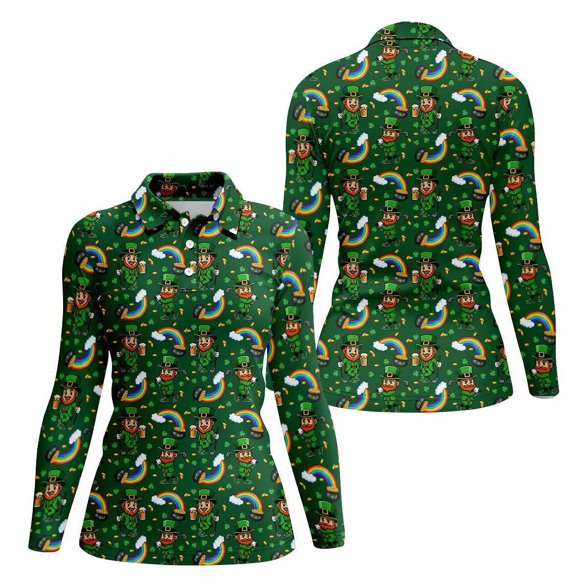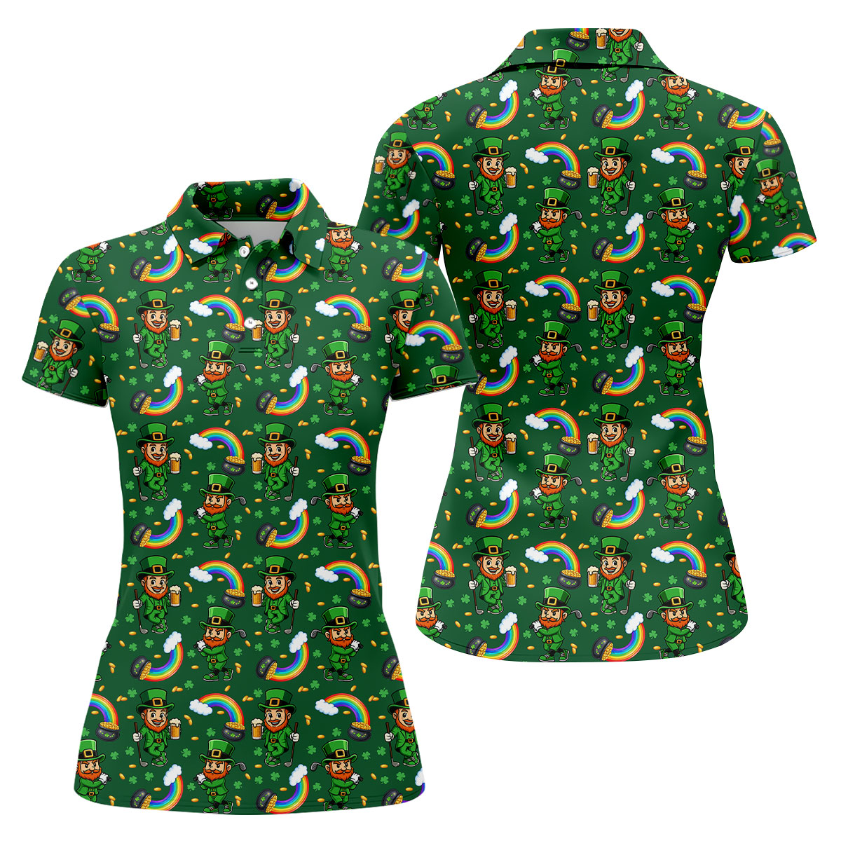 St Patrick's Day Leprechaun Golf Pose Rainbow Gold Pot Shamrock Golf Shirt, Women's Golf Shirts, Ladies Golf Polos