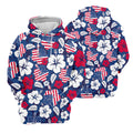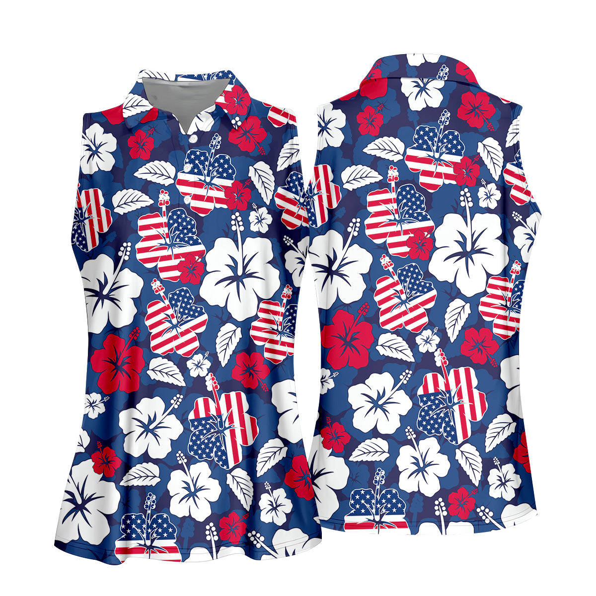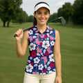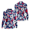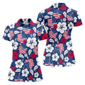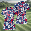 Tropical Hibiscus American Flag Womens Golf Polo Shirt, Women's 4th Of July Shirts, Custom Ladies Golf Shirt