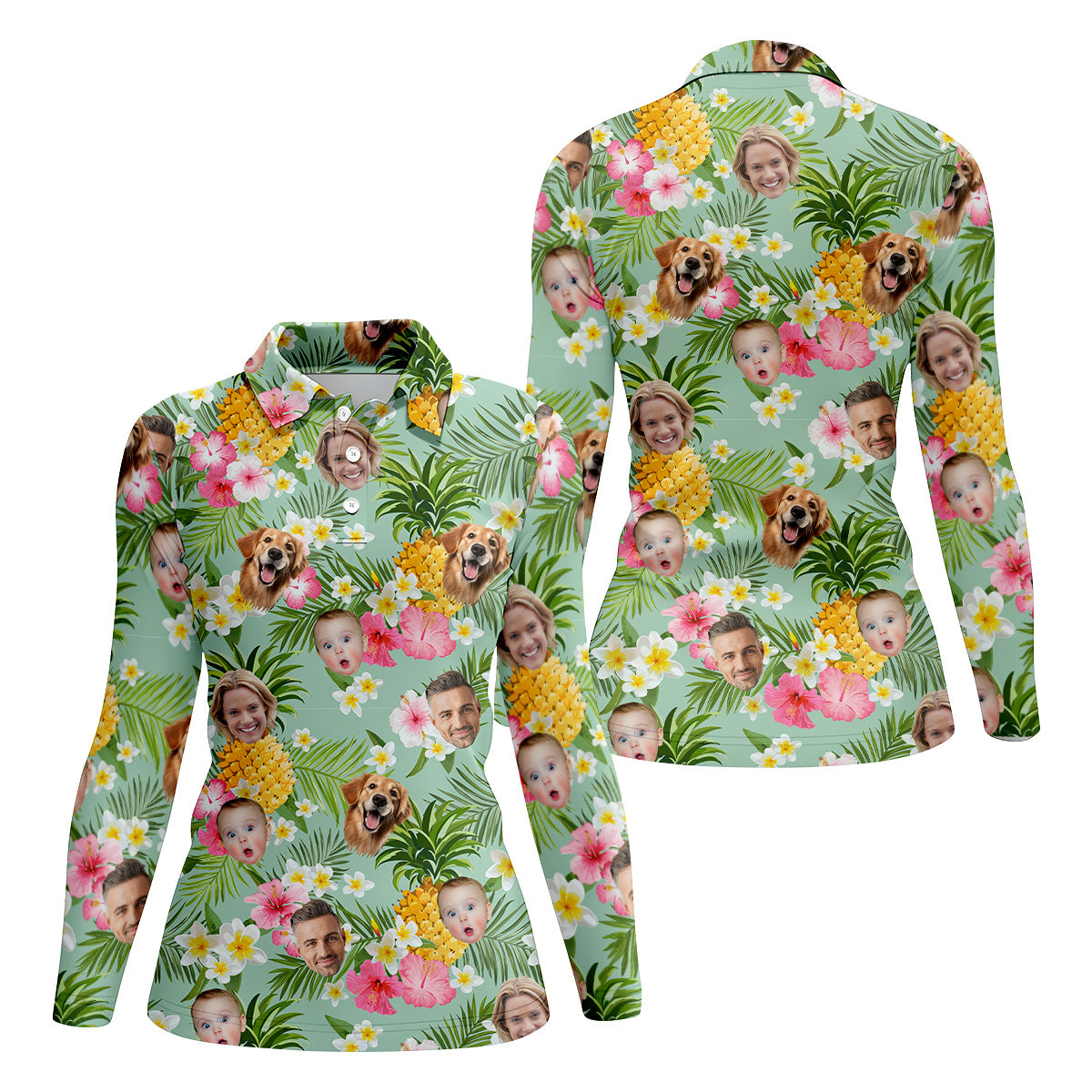 Yellow Pineapple Floral Hawaiian Shirt, Custom Face Shirt, Ladies Long Sleeve Golf Shirts, Ladies Golf Polos