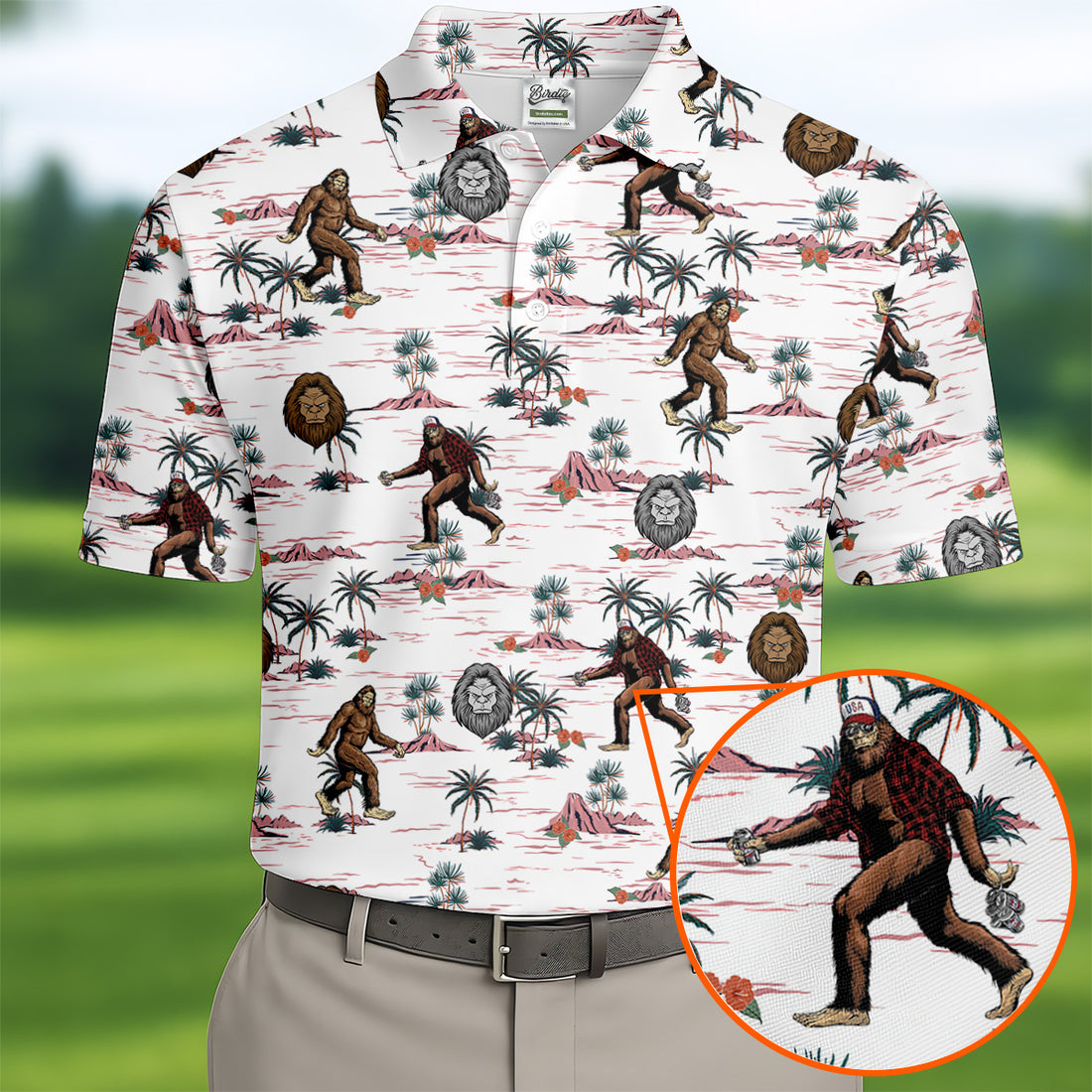 White Funny Sasquatch Tropical Golf Shirts, Fun Men's Golf Polos, Hawaiian Golf Shirts, Golfing Apparel
