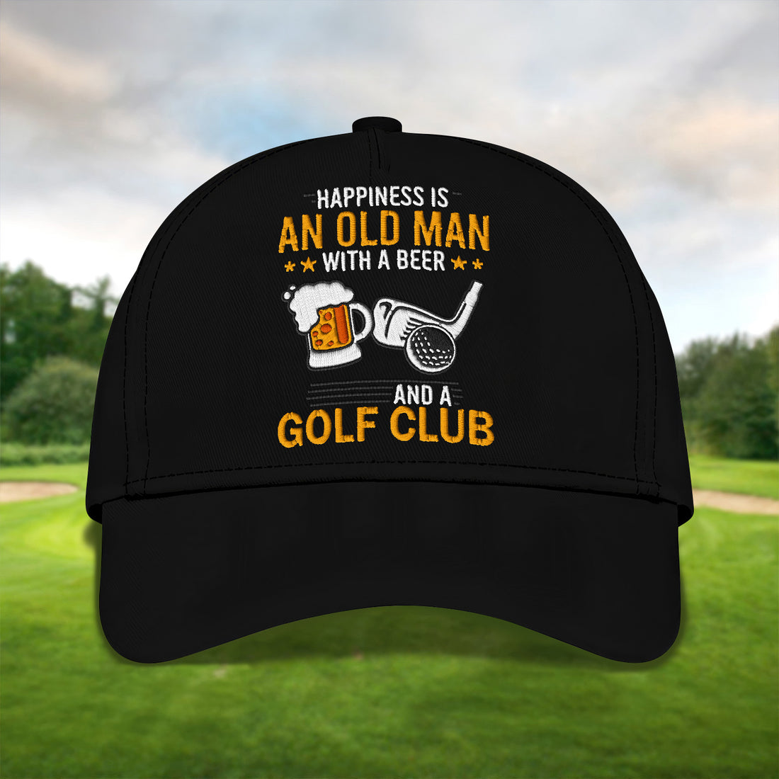 Happiness Is An Old Man With A Beer And A Golf Club Embroidered Baseball Cap, Golf Hat, Dad Golf Gift