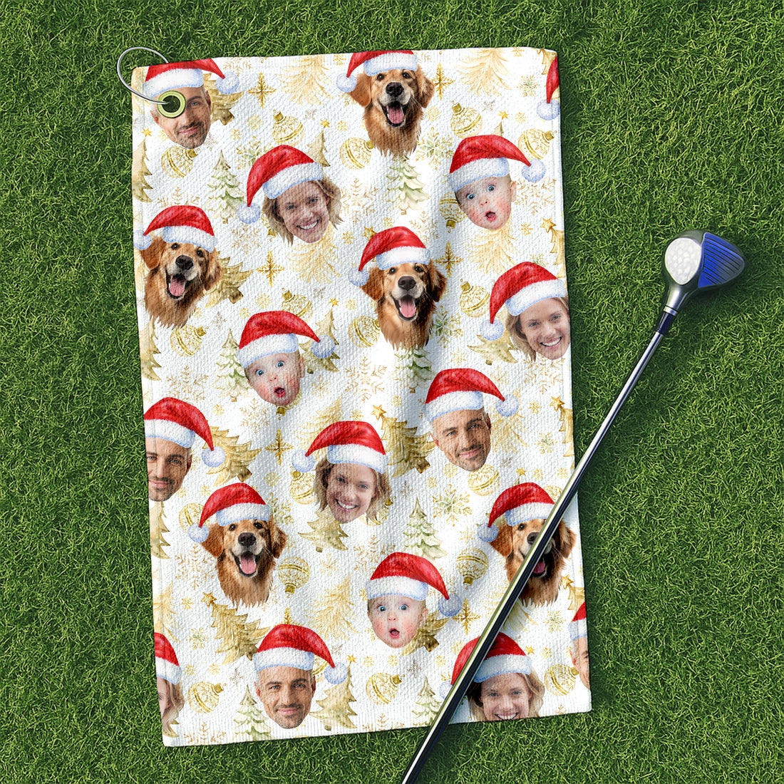 Custom Face Xmas Pattern Golden Print Golf Towels, Christmas Golf Gift, Custom Golf Accessories