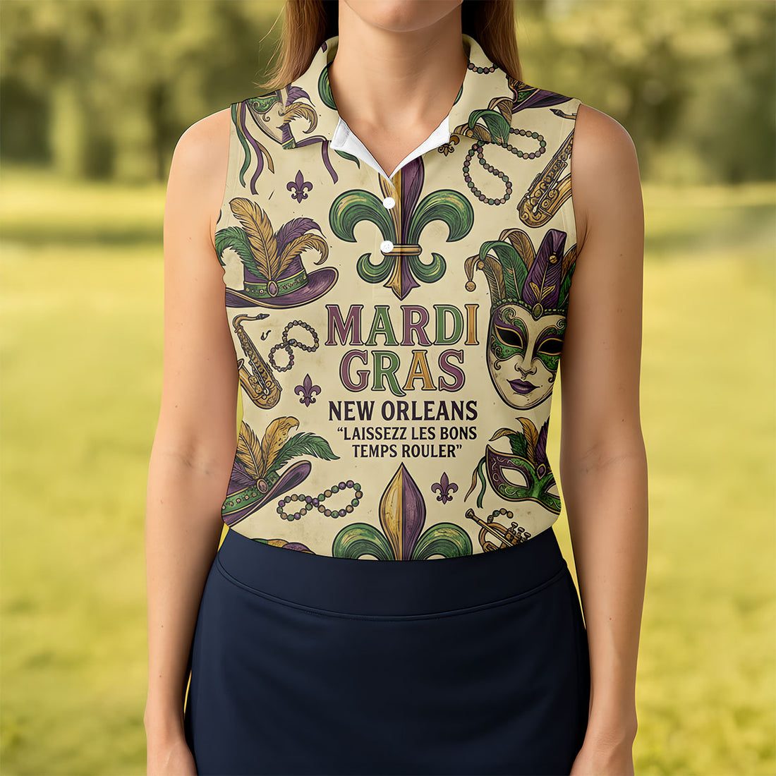 Fleur De Lis Floral Crown Mardi Gras Mask Print Women's Golf Tops, Ladies Golf Shirts, Ladies Golf Polos