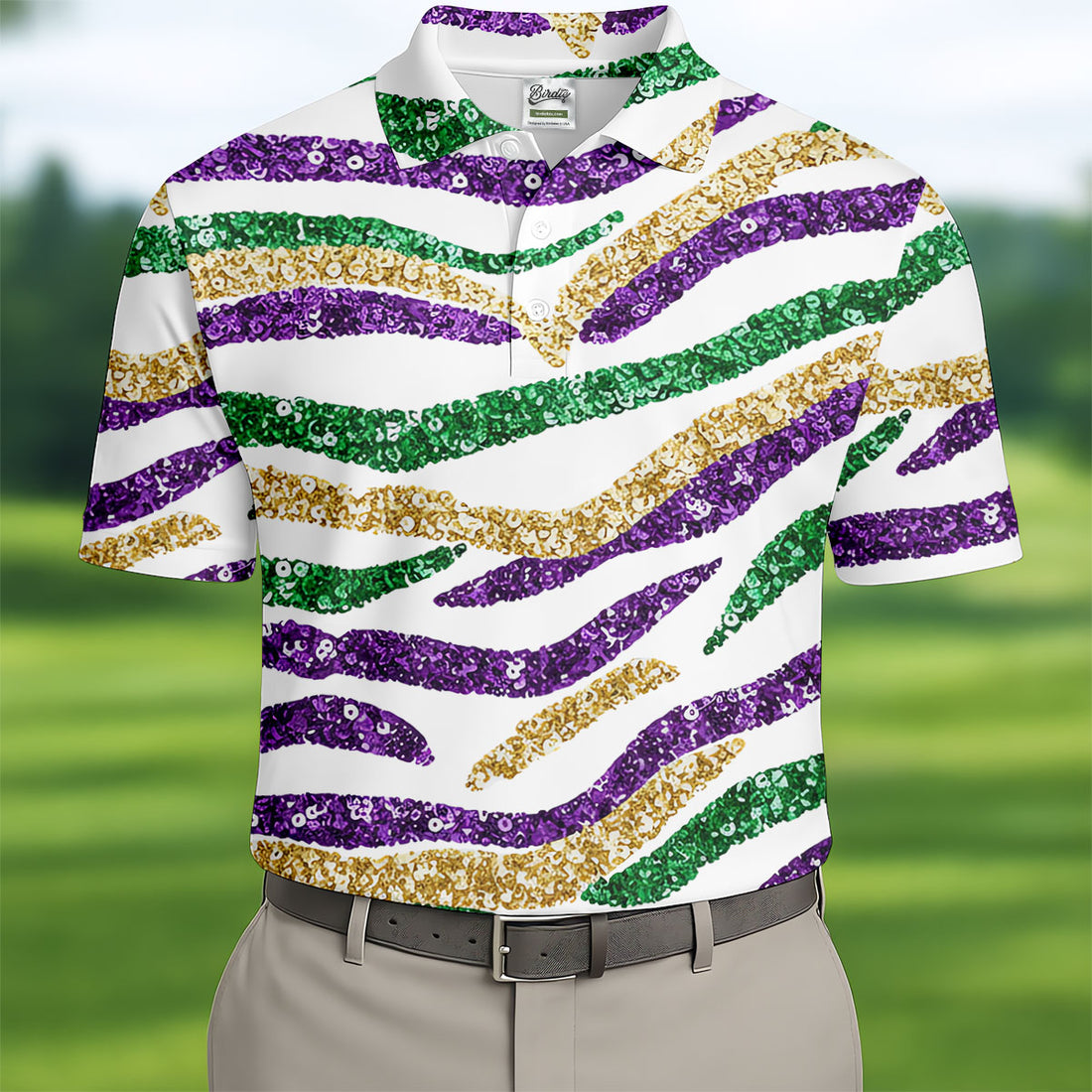 Purple Green Gold Sequin Pattern White Mardi Gras Golf Shirt, Polo Shirts For Men, Golf Shirts For Men