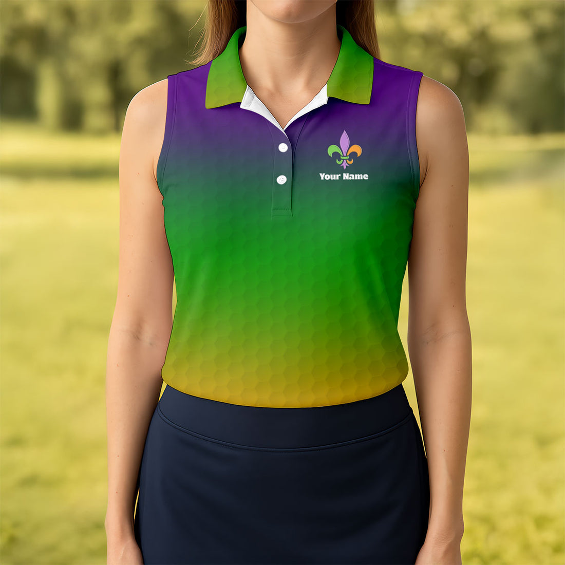 Mardi Gras Purple Gold Green Blended Color Golf Ball Pattern Women's Golf Tops, Women's Golf Shirts, Ladies Golf Polos