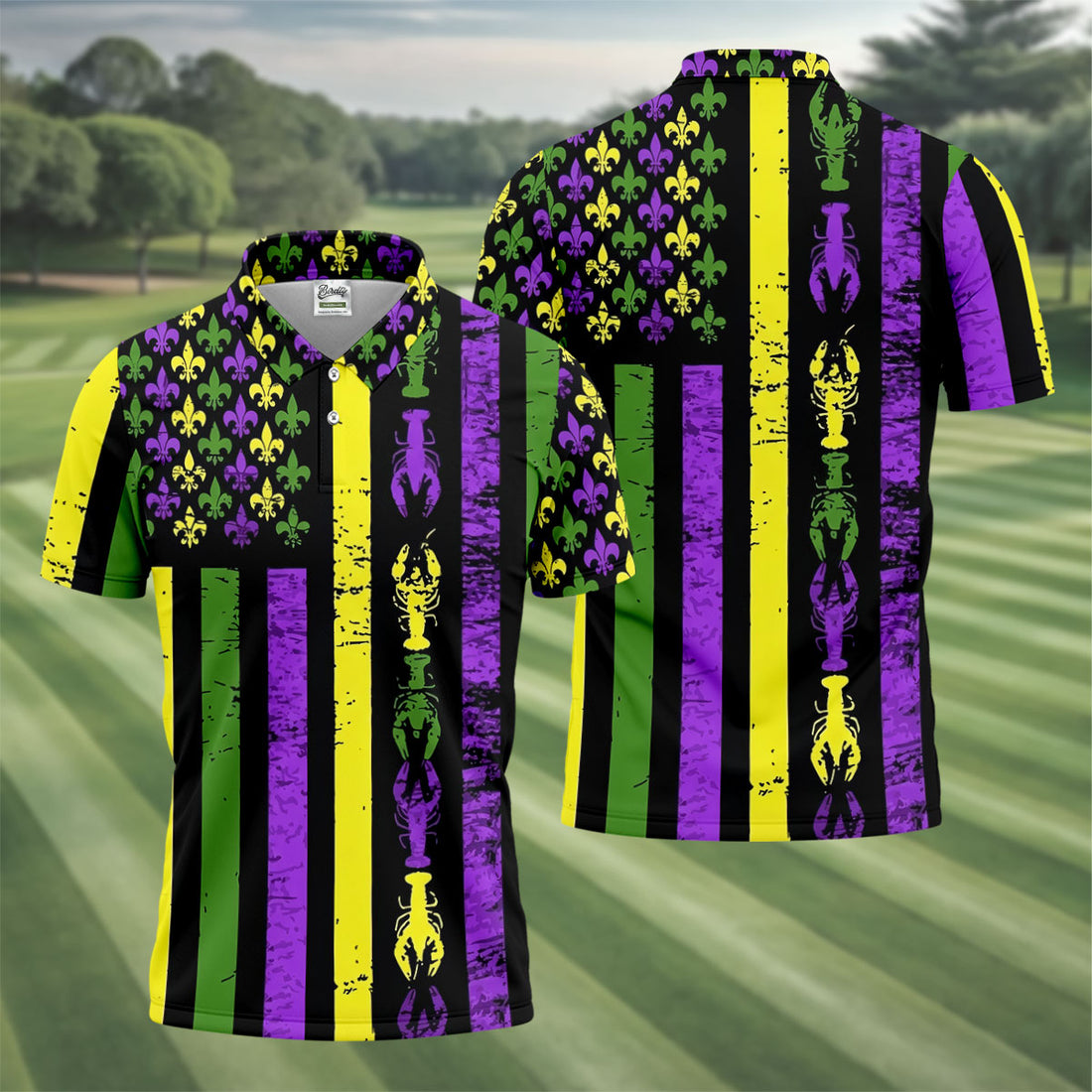 Mardi Gras Flag Fleur-De-Lis Symbol Crawfish Pattern Golf Tops For Men, Polo Shirts For Men, Golf Shirts For Men