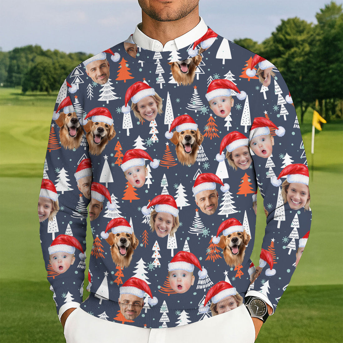 Custom Face Xmas Pine Tree Green Golf Ugly Sweater, Christmas Golf Shirt, Golf Sweater, Christmas Golf Gift