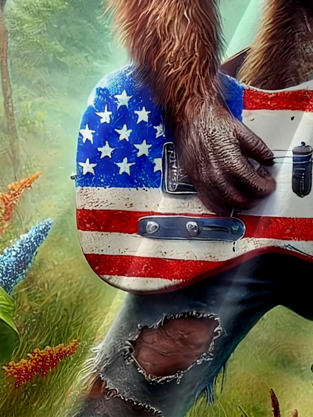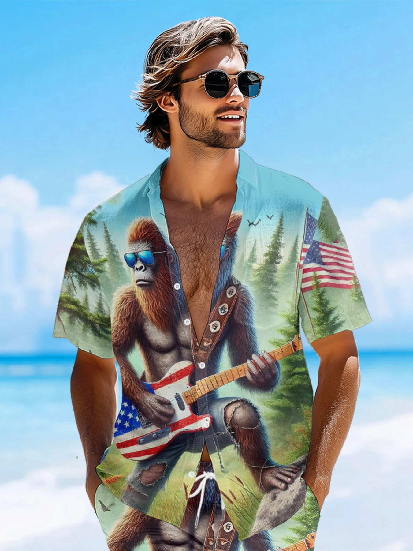 American Flag Patriot Bigfoot Guitar Rock Hawaiian Golf Shirt, 250th Anniversary Tropical Vibe Men's Golf Shirt