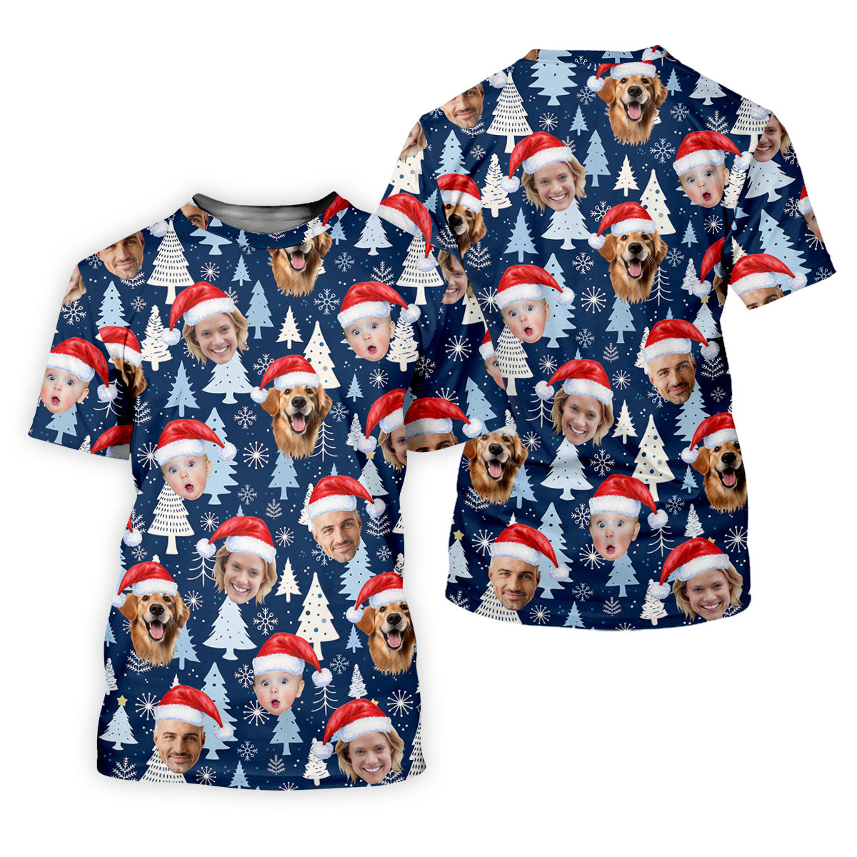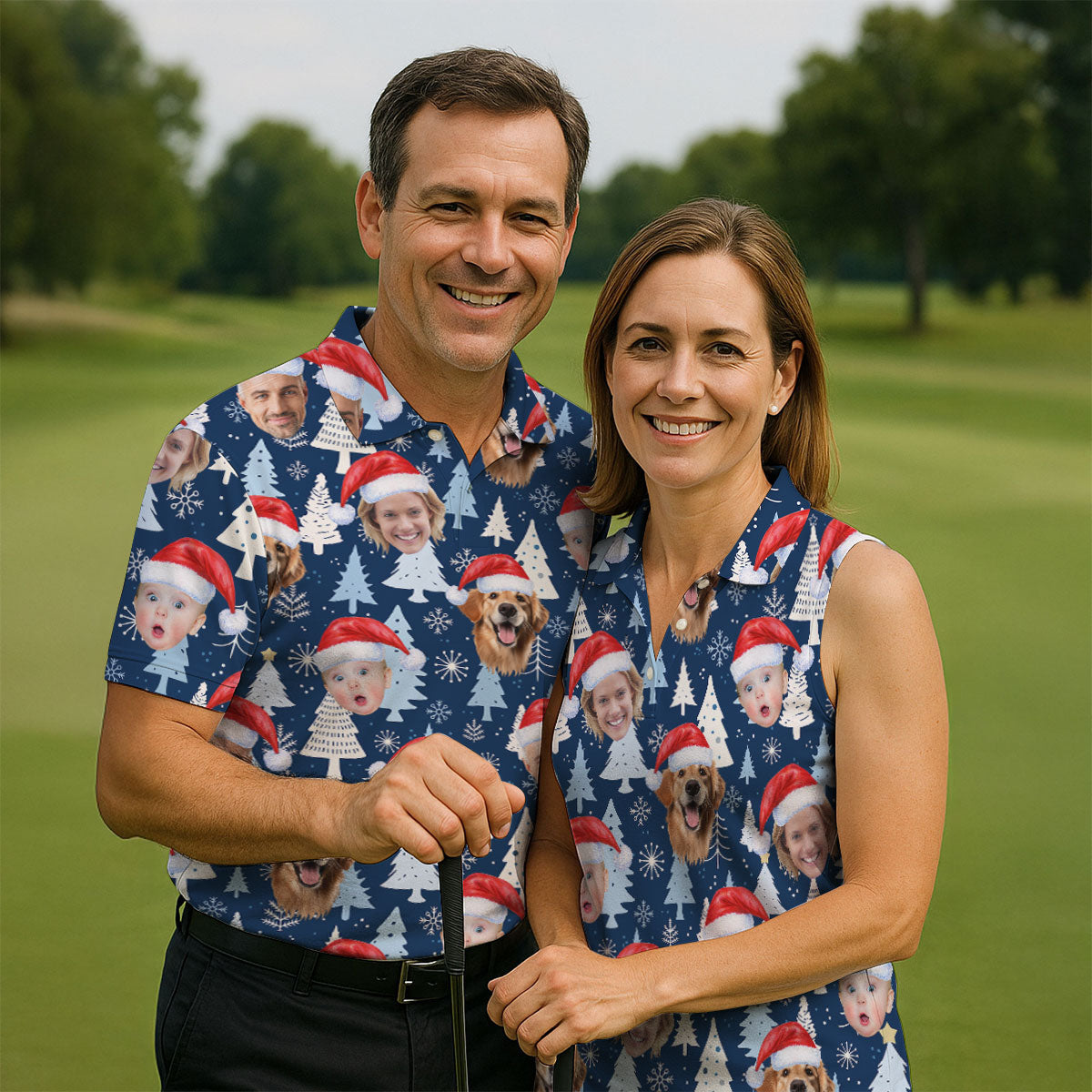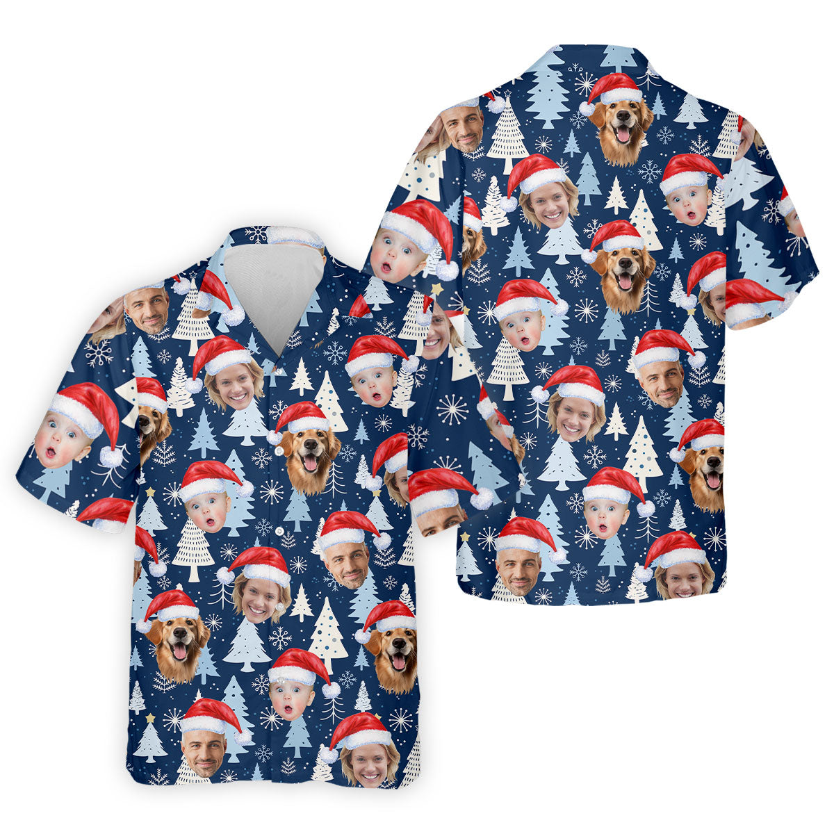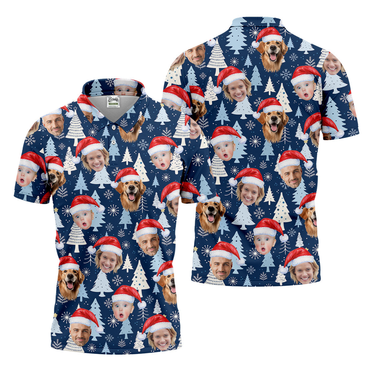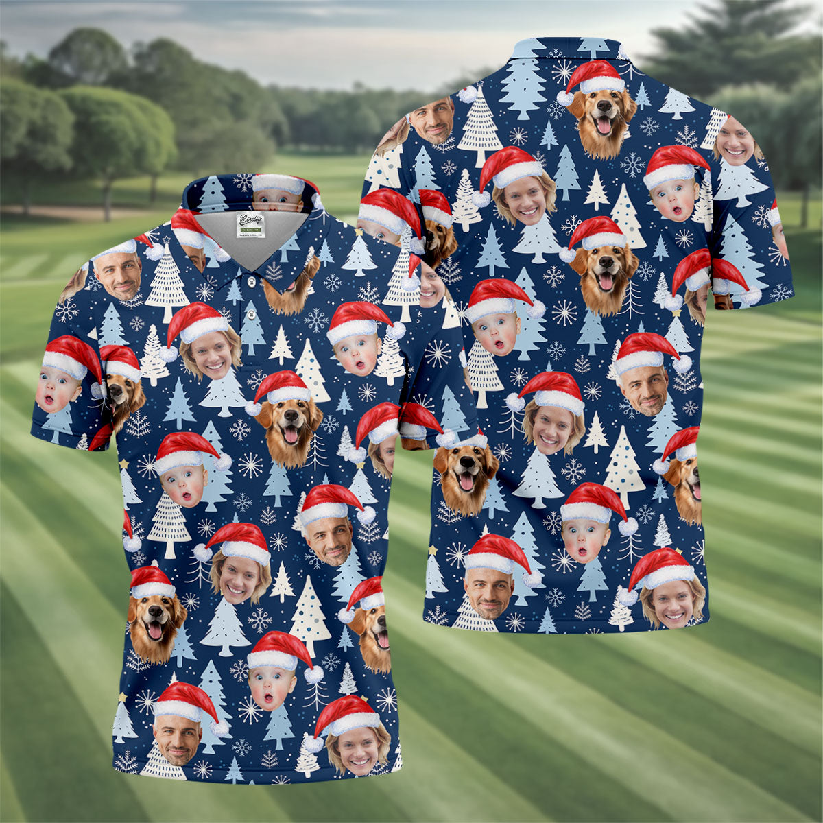 Custom Face Pine Tree Pattern White And Navy Christmas Golf Shirt, Golf Shirts For Men, Golf Gift For Men