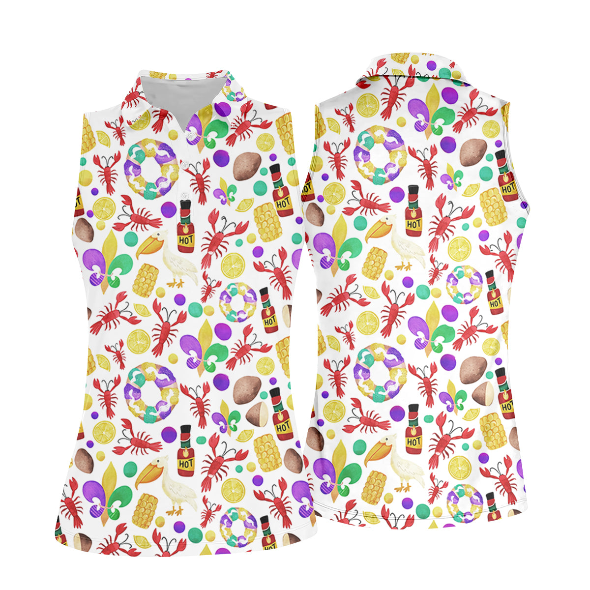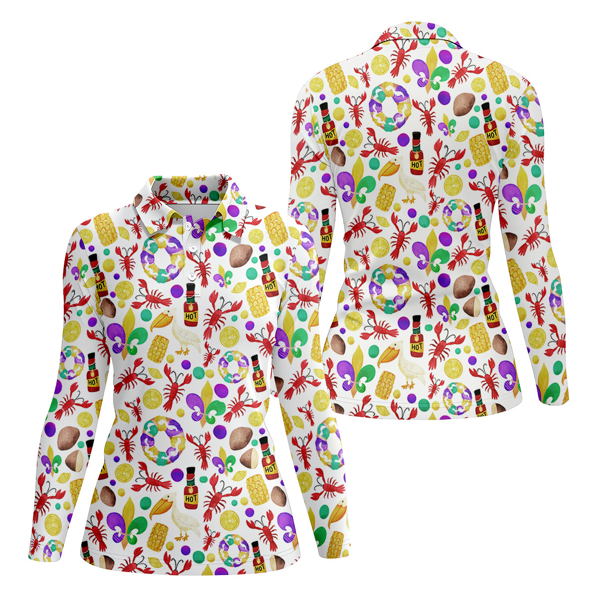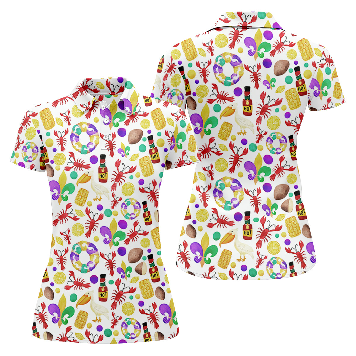 Fleur De Lis Flower White Pelican Lobster Hot Sauce Mardi Gras Golf Shirt, Women Golf Top, Ladies Golf Polos